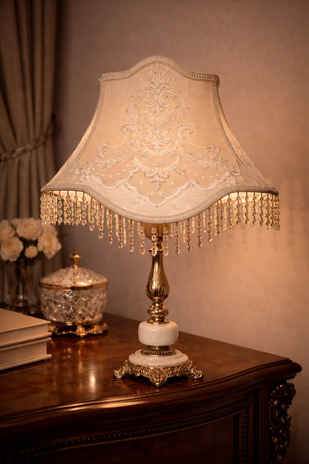 يُعدّ هذا المصباح تحفة فنية متكاملة، صُنعت بدقة متناهية لتكون رمزًا للفخامة في مساحتك الخاصة. يتميز بقاعدة رائعة تجمع بين النحاس الأصلي المنقوش يدويًا والرخام الطبيعي المصقول. ويتوج المصباح بغطاء مصنوع من أجود أنواع قماش الجيبور التركي المستورد، والمطرز بدقة بنقوش كلاسيكية، ليُوفر إضاءة ناعمة ودافئة تُضفي جوًا من السكينة والرقي.