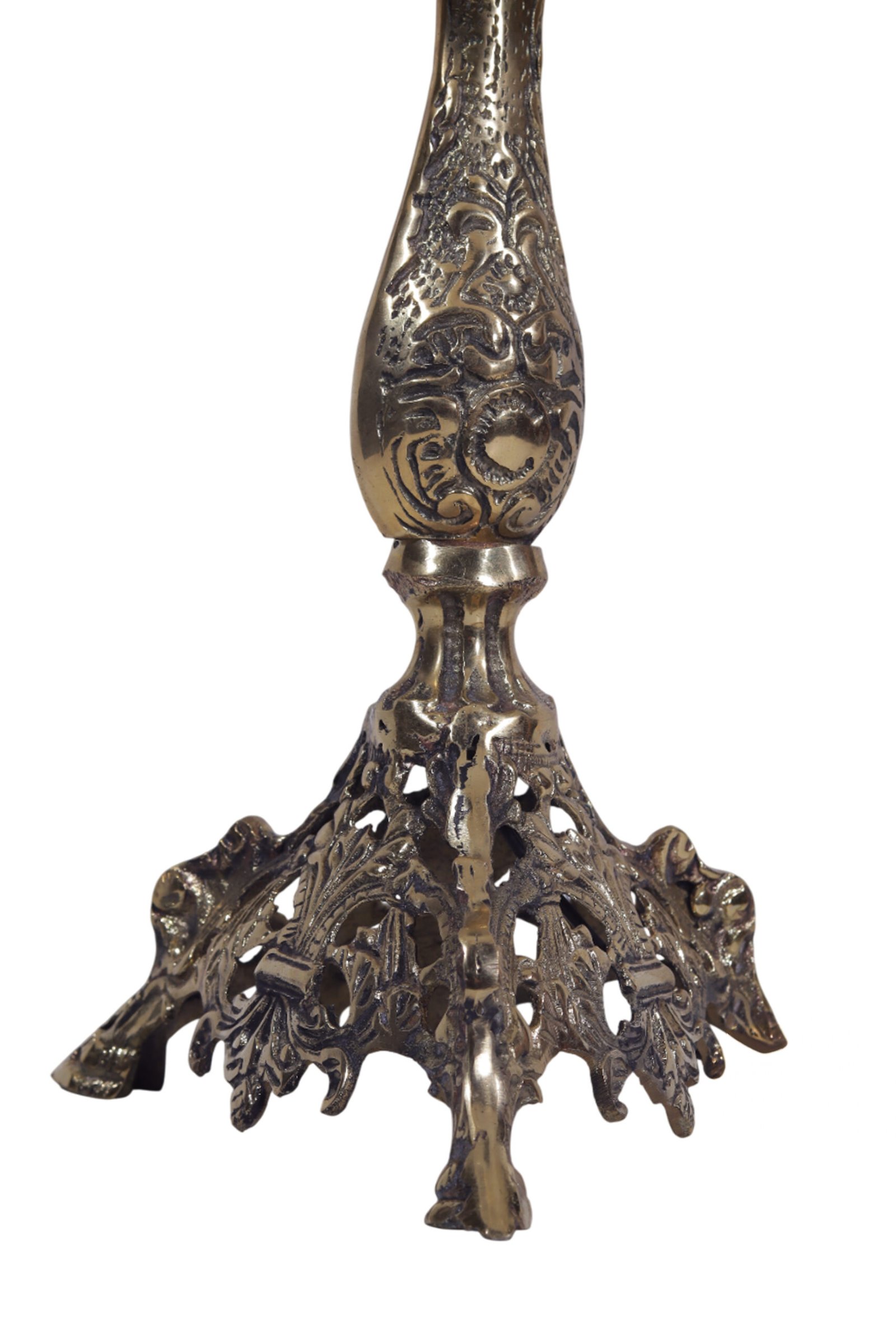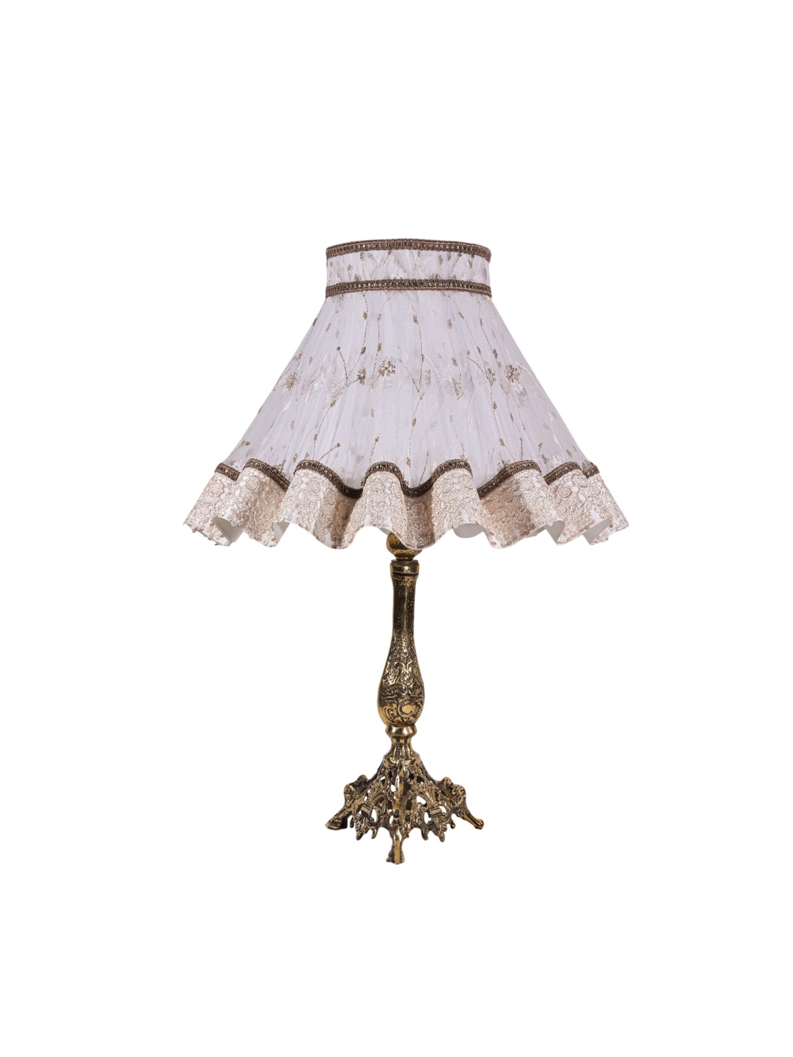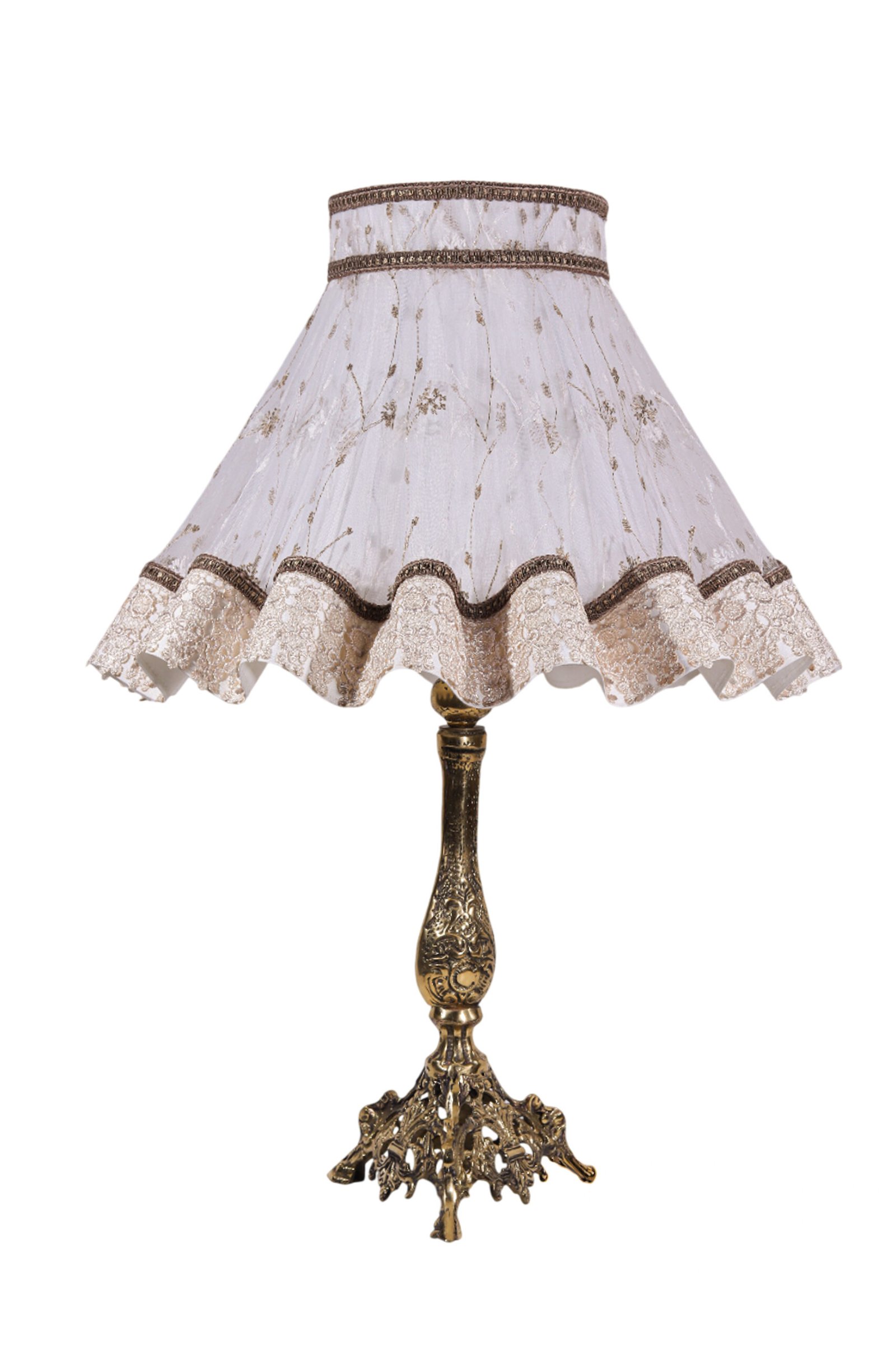 Classic brass table lamp with a wide, elegantly embroidered “Gody” style shade.