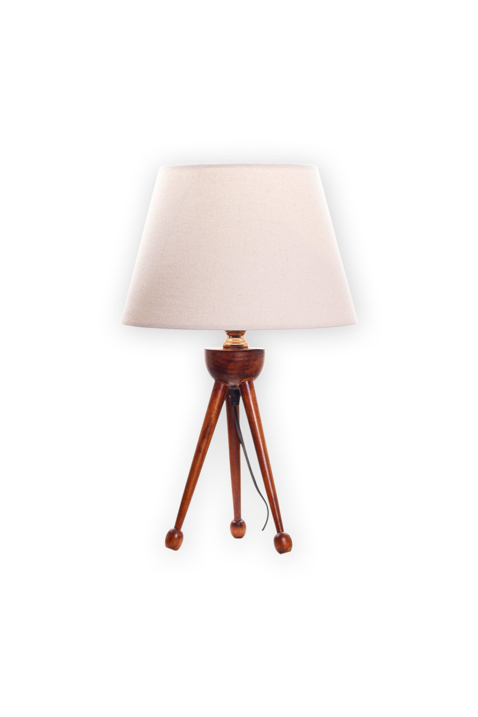 مصباح طاولة بتصميم ثلاثي القوائم مصنوع من خشب الزان باللون البني الداكن وغطاء بيج.