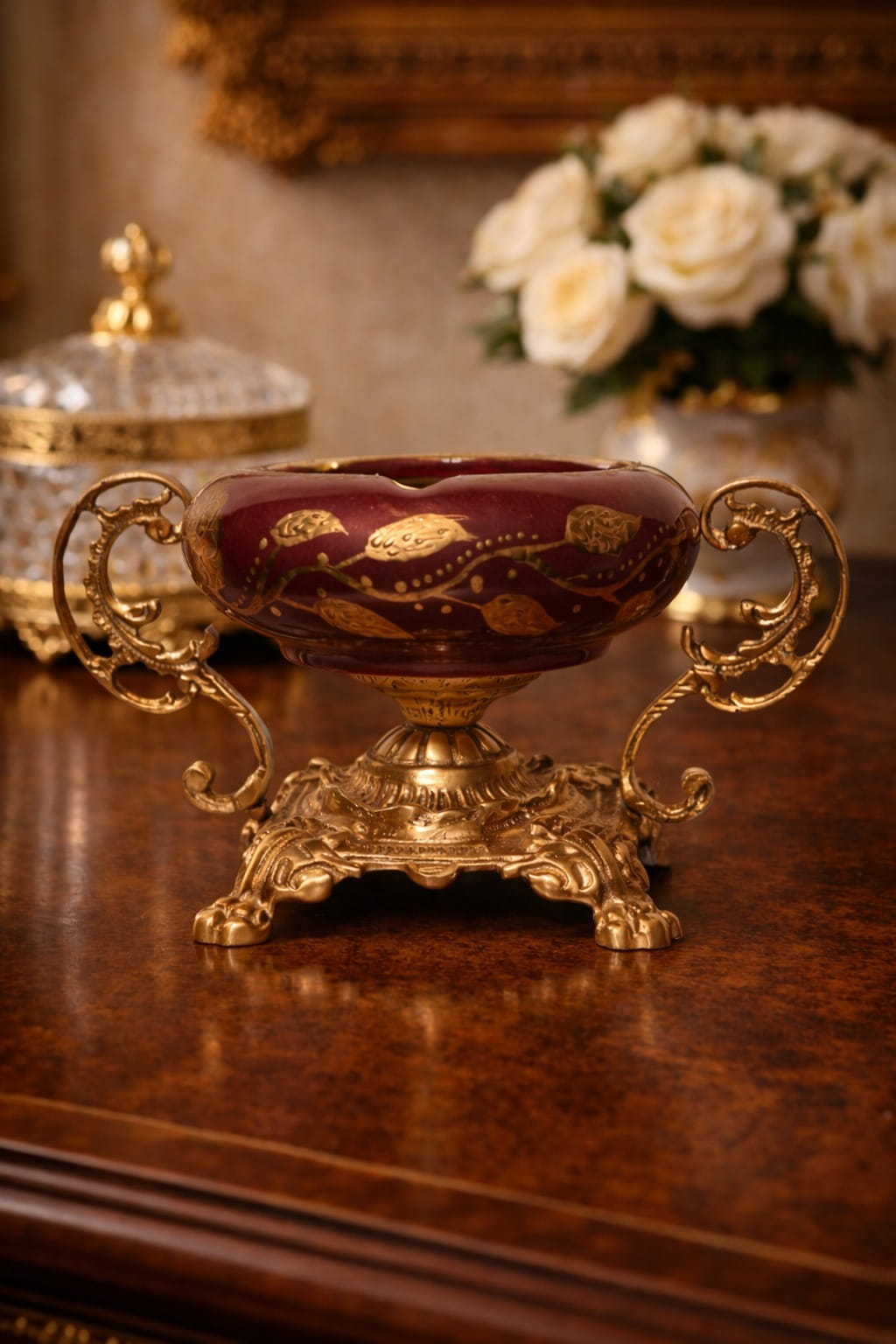 هذه القطعة تحفة فنية متكاملة، مصنوعة من سيراميك بورغندي فاخر مزين برسومات زهرية ذهبية مرسومة يدويًا، ومتوازنة تمامًا مع قاعدة ومقابض من النحاس العتيق الأصيل. صُممت لتكون محورًا أنيقًا في صالونك أو مكتبك، وتعكس ذوقًا رفيعًا في اقتناء القطع النادرة التي تجمع بين الفن والعملية.