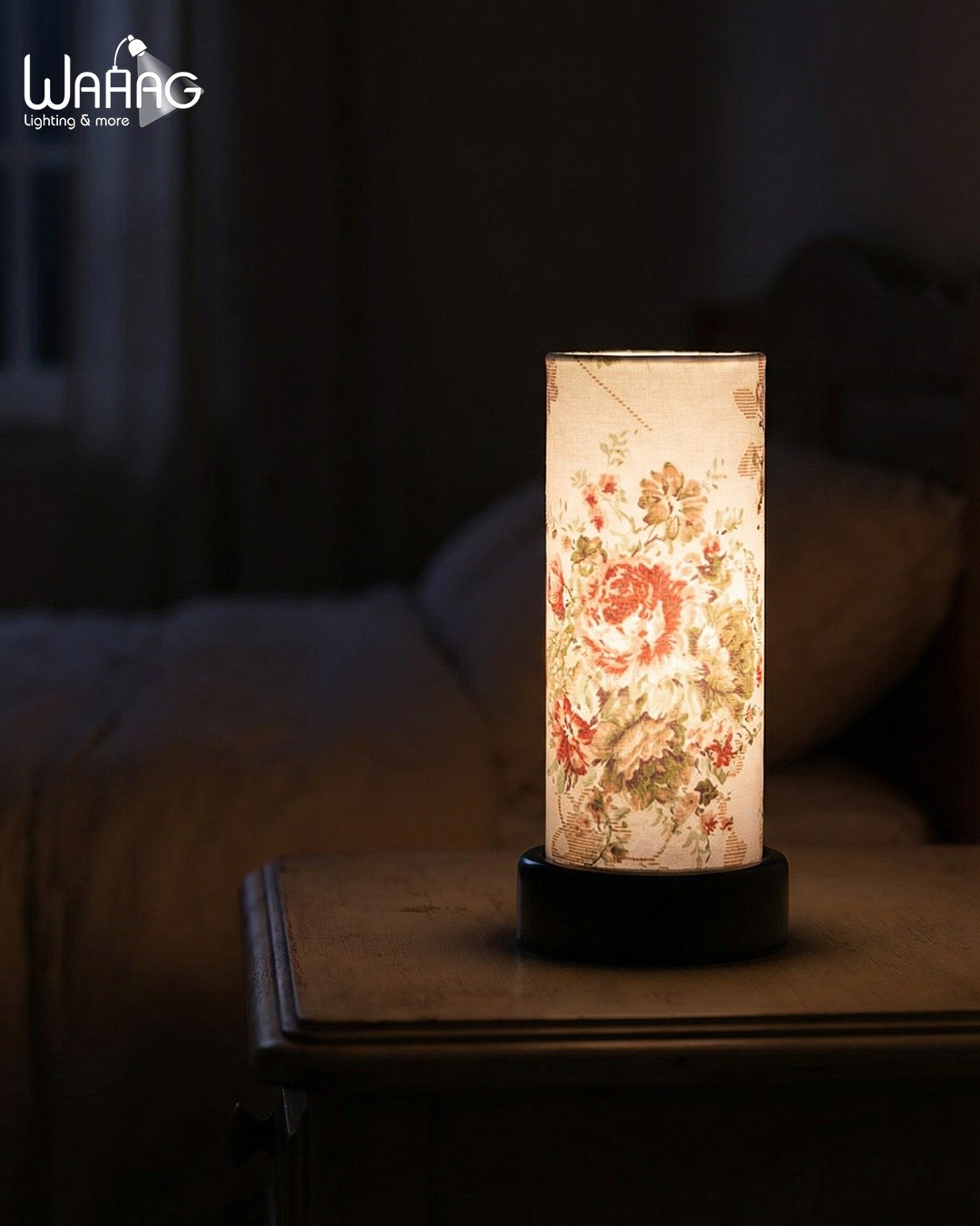 مصباح طاولة بتصميم أسطواني، يتميز بقاعدة خشبية سوداء وغطاء بنمط زهور.