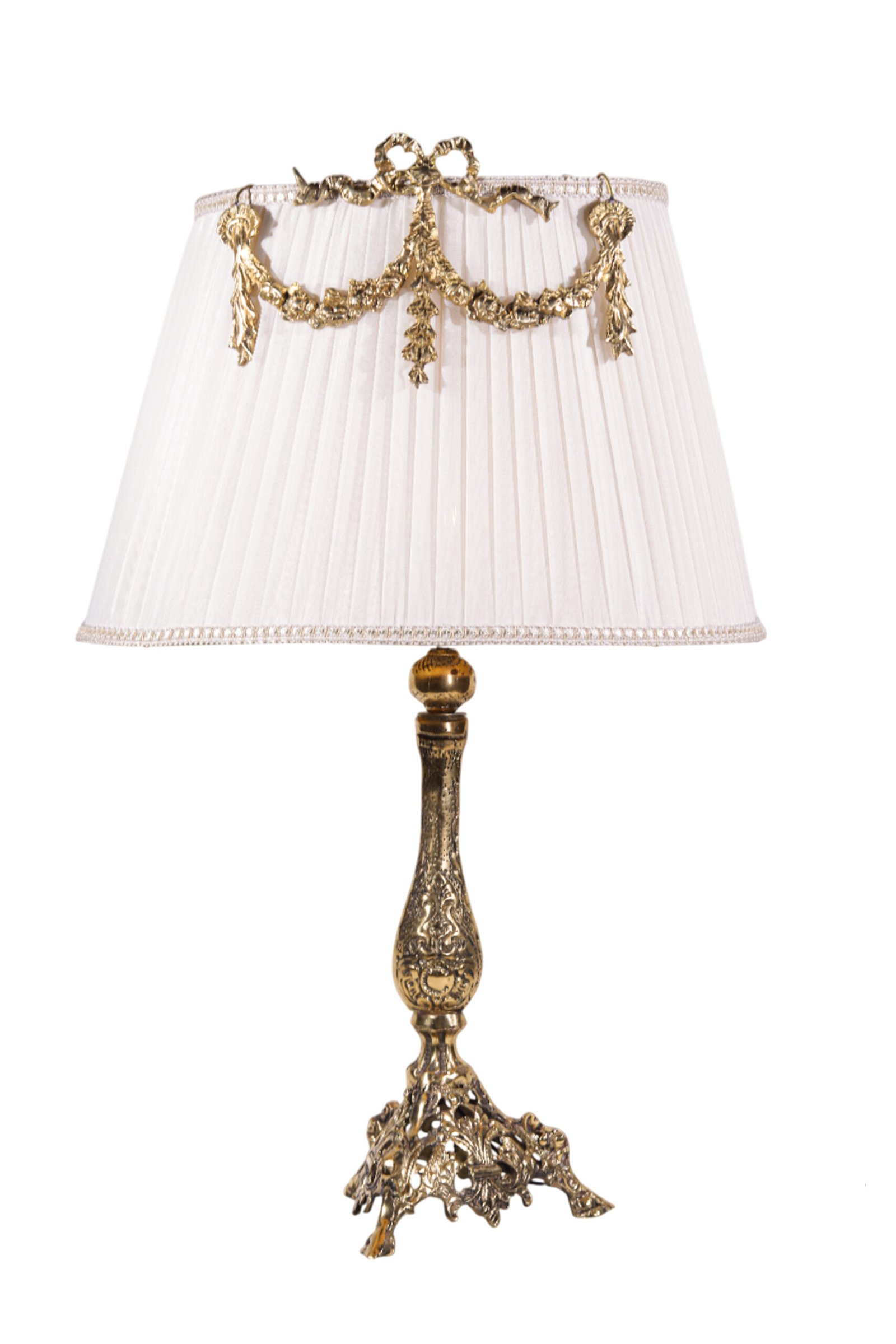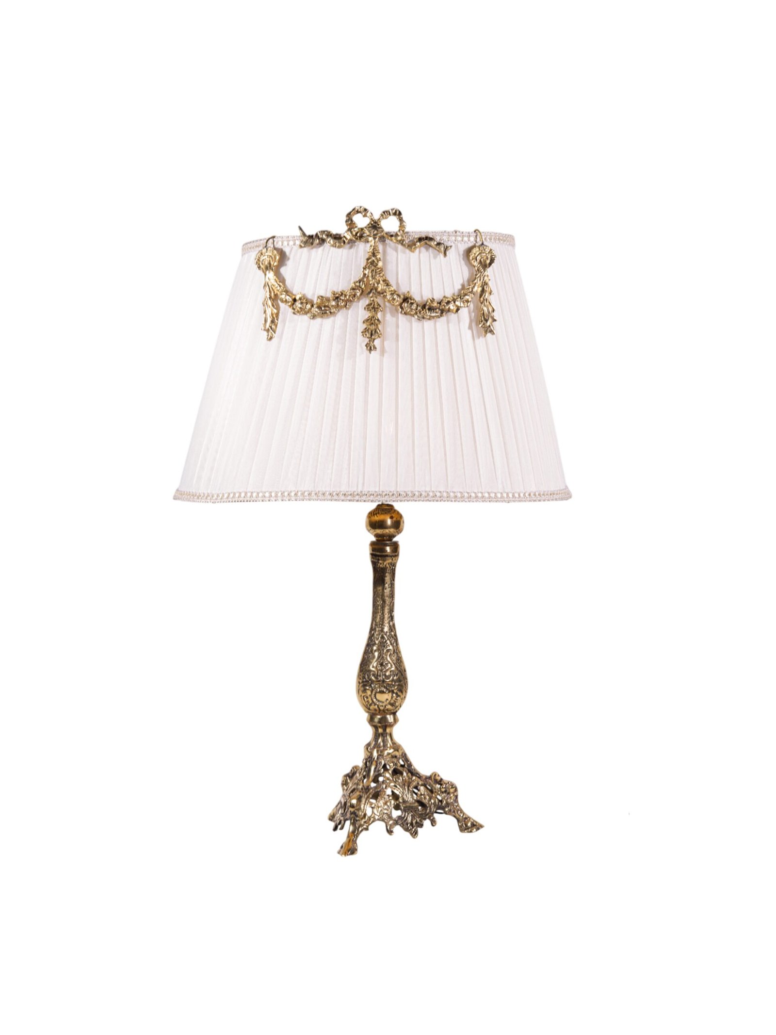 مصباح طاولة كلاسيكي من النحاس مع غطاء بيضاوي يتميز بزخرفة نحاسية قابلة للفصل.