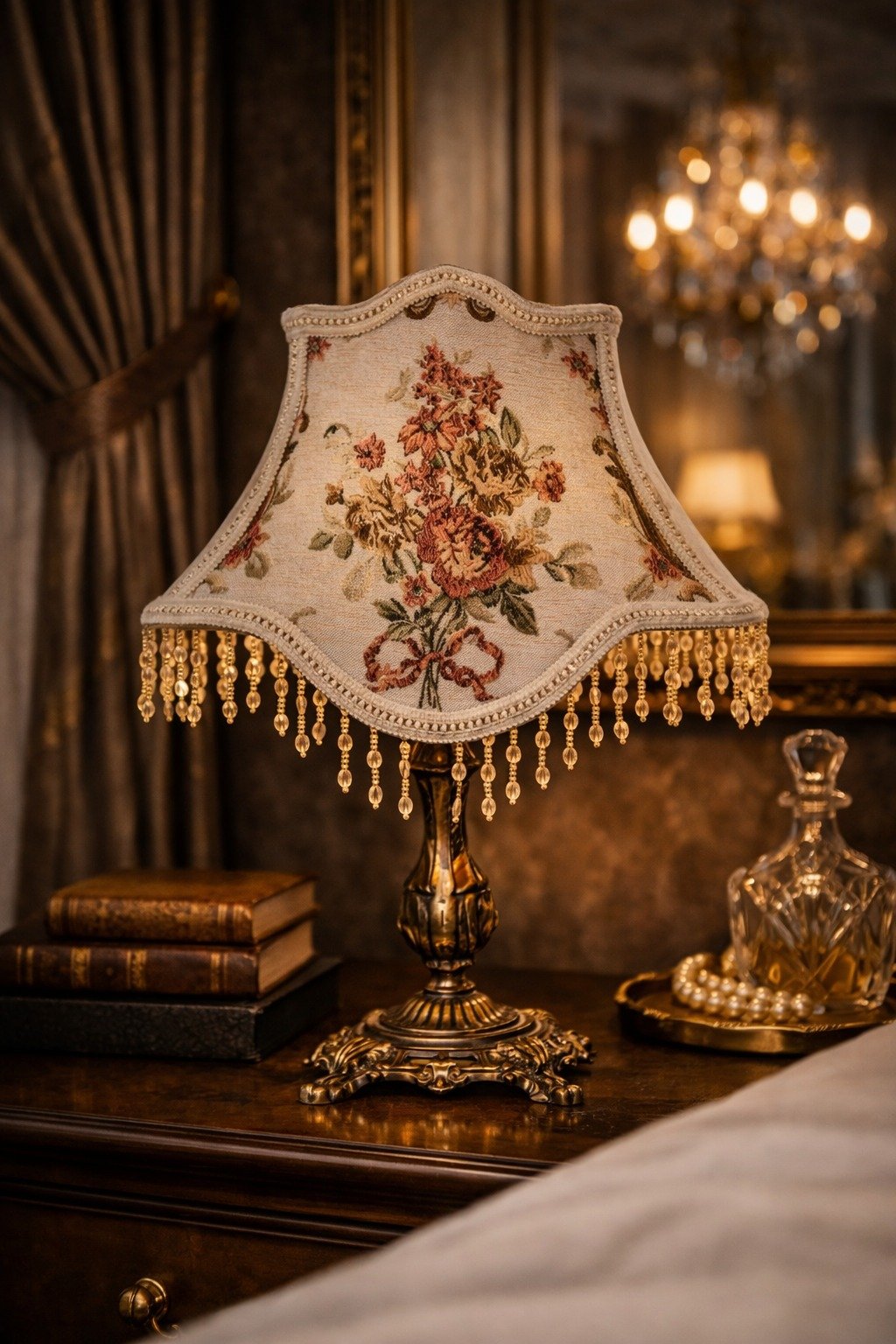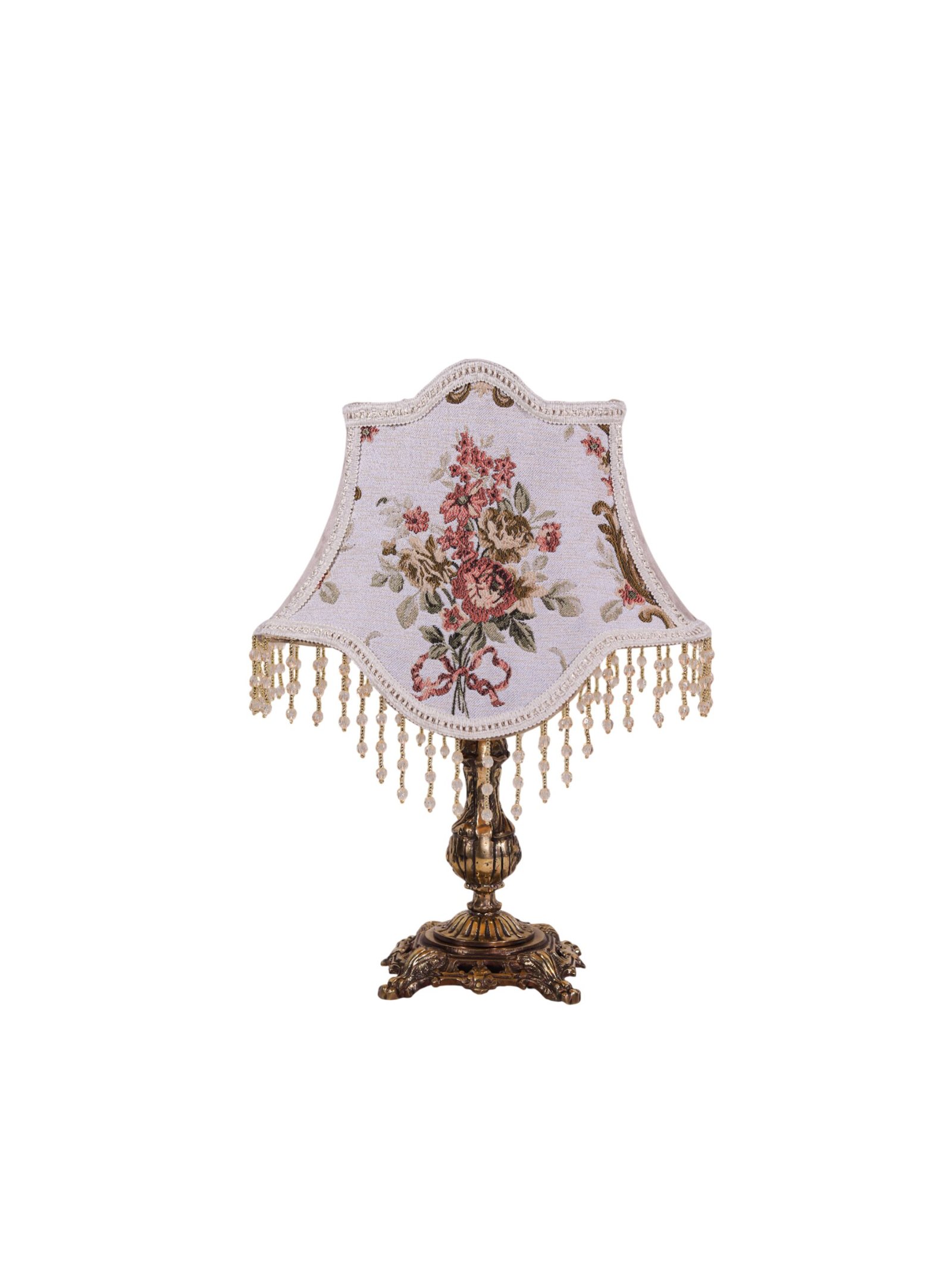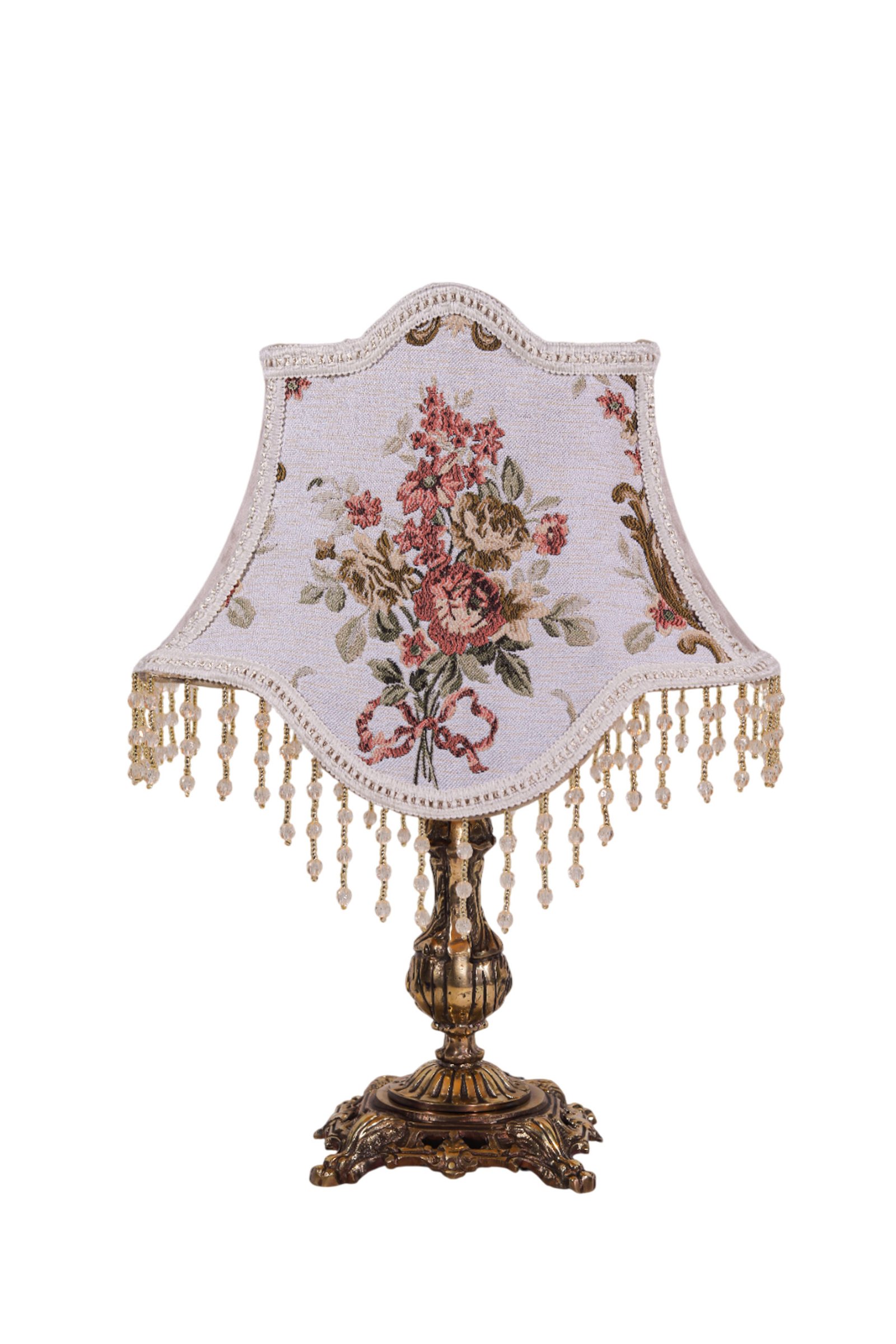Classic brass table lamp with a floral Gobelin fabric shade and crystal beads.
