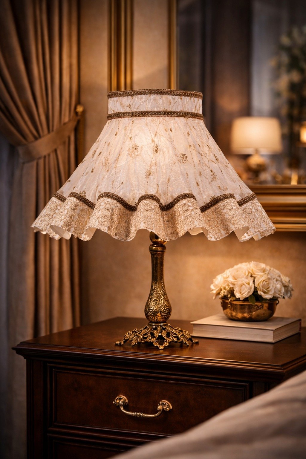Classic brass table lamp with a wide, elegantly embroidered “Gody” style shade.