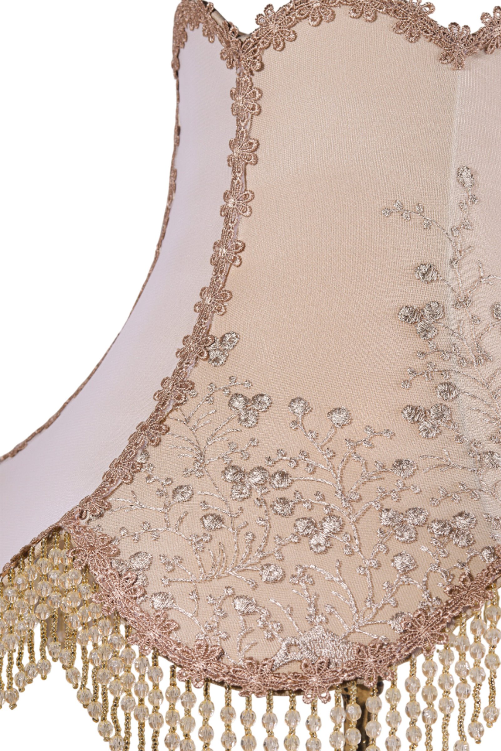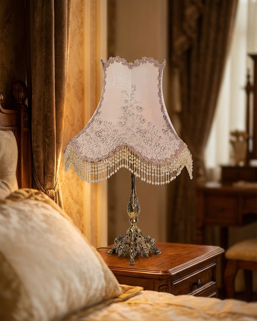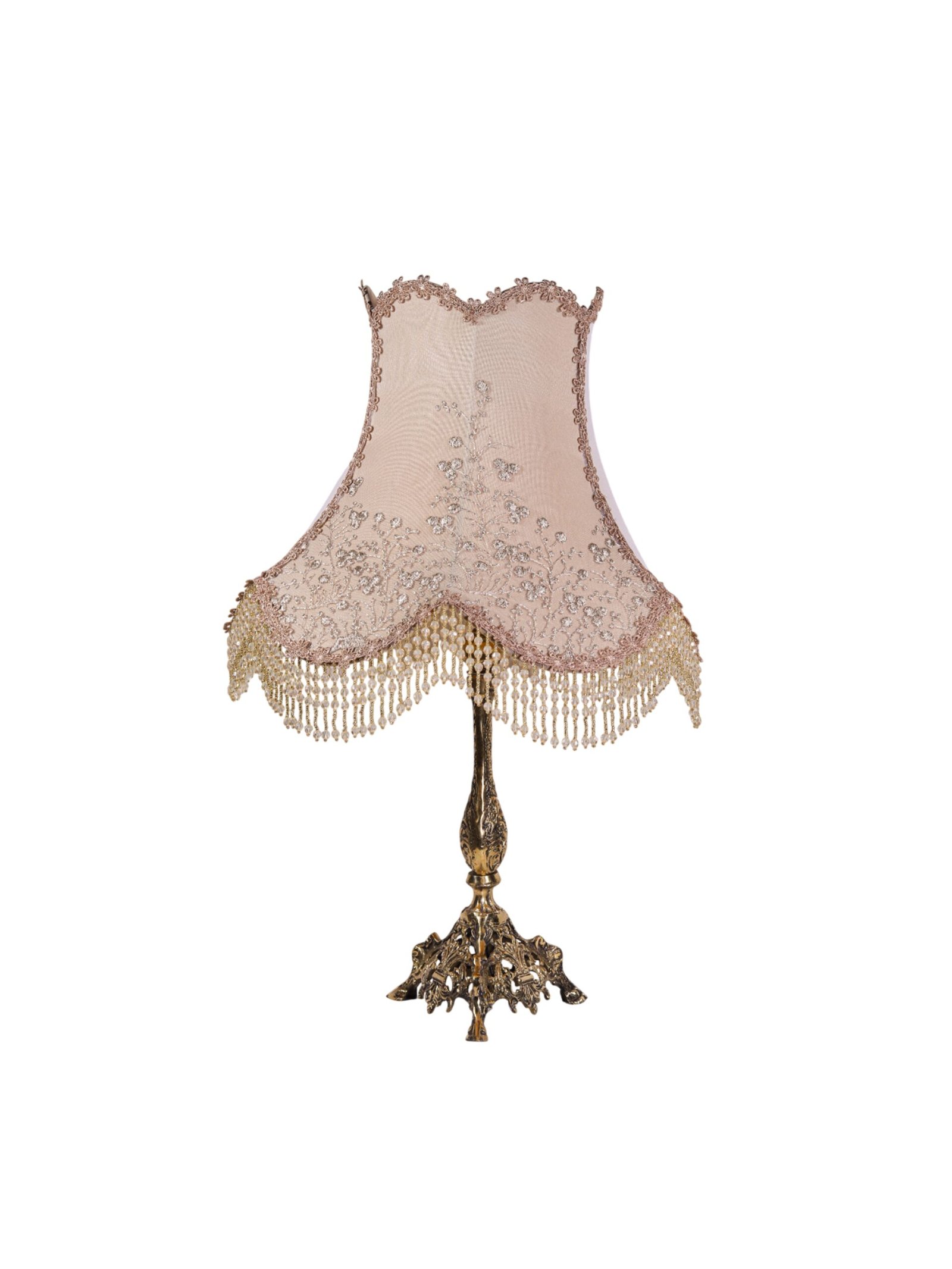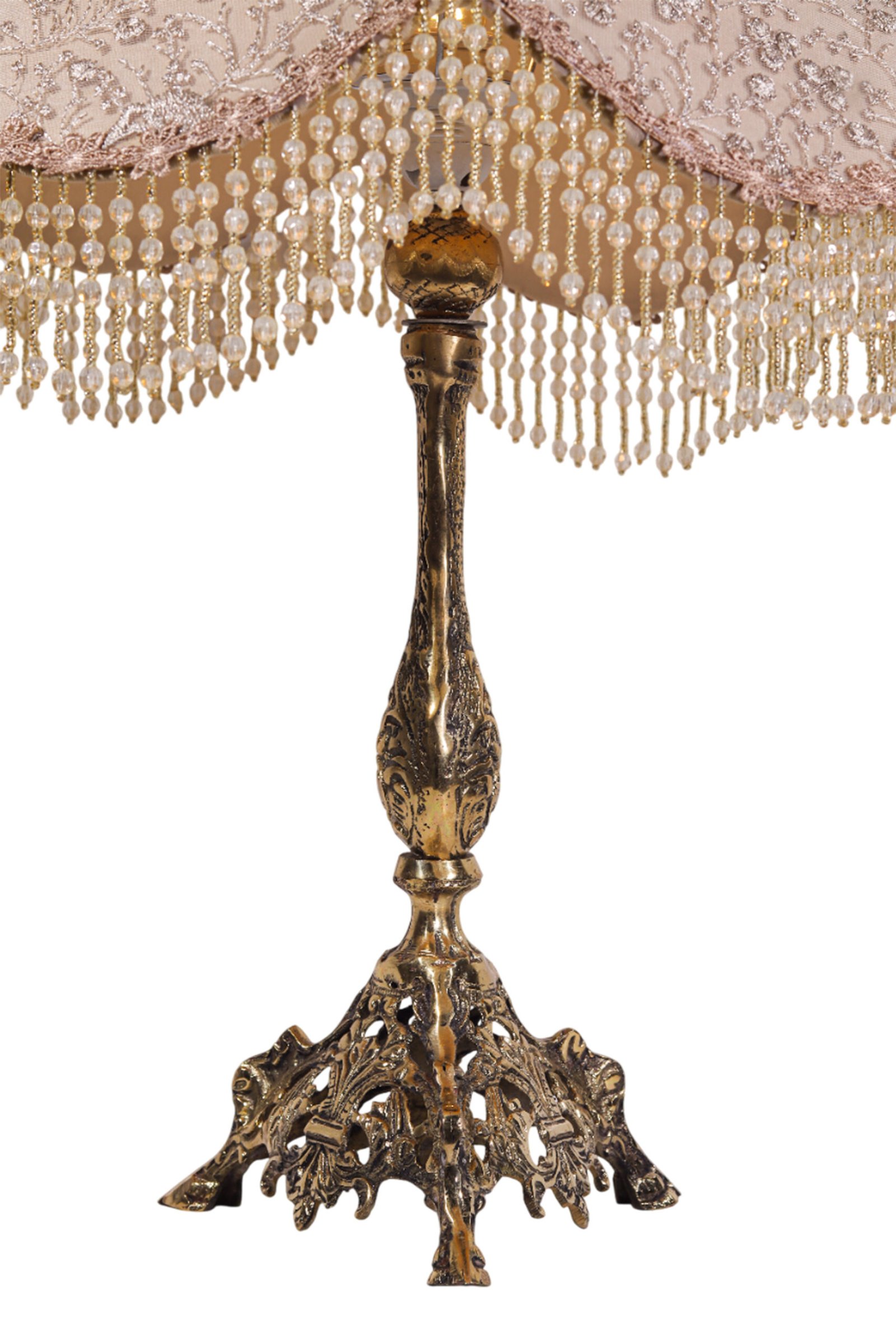 Classic brass table lamp with a “French Style” shade made of luxurious Turkish Guipure and crystal beads.