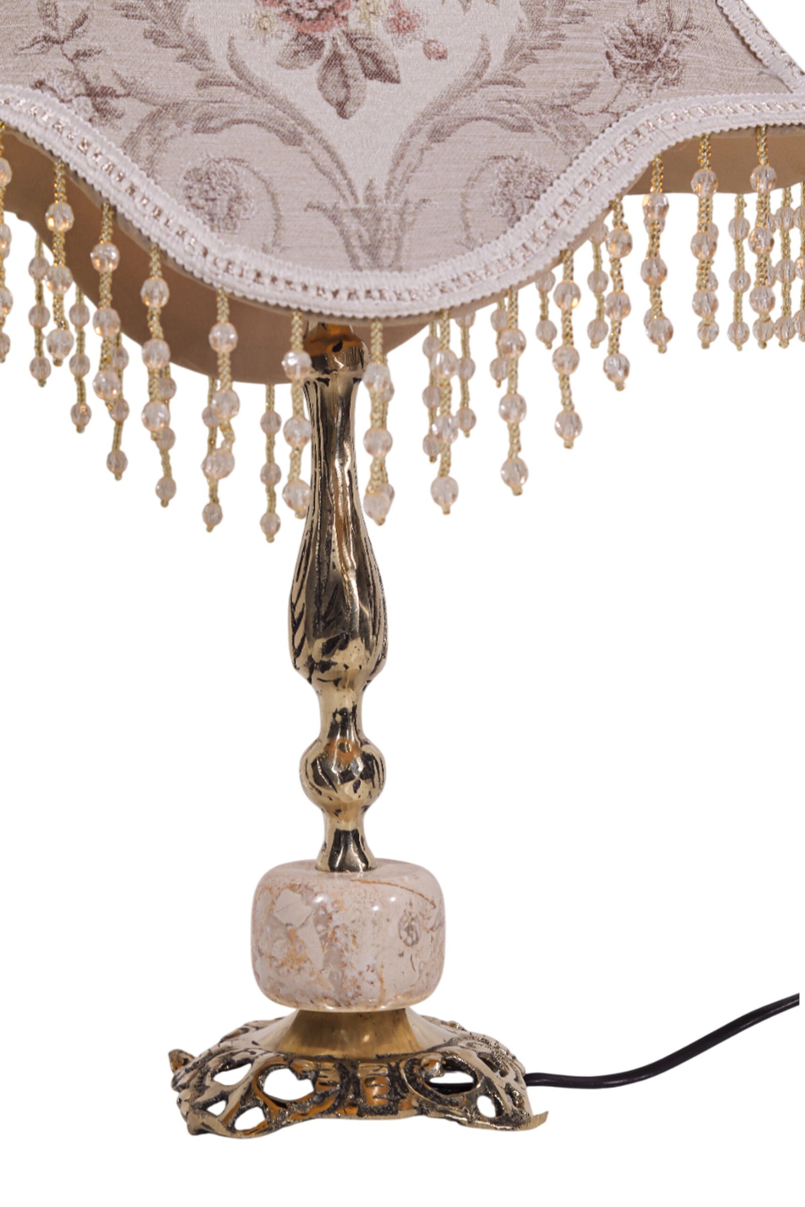 Classic brass table lamp with a distinctive “Sleep Style” Silk Damask shade and crystal beads.