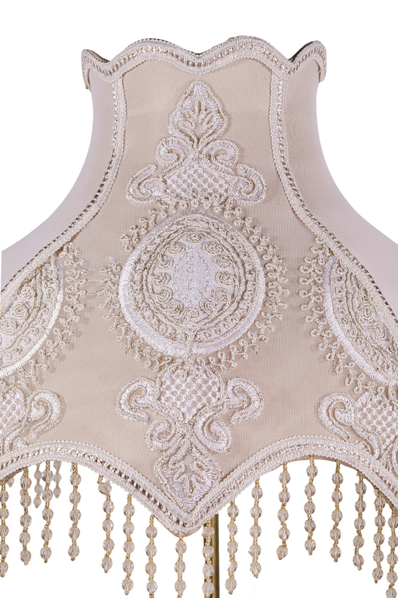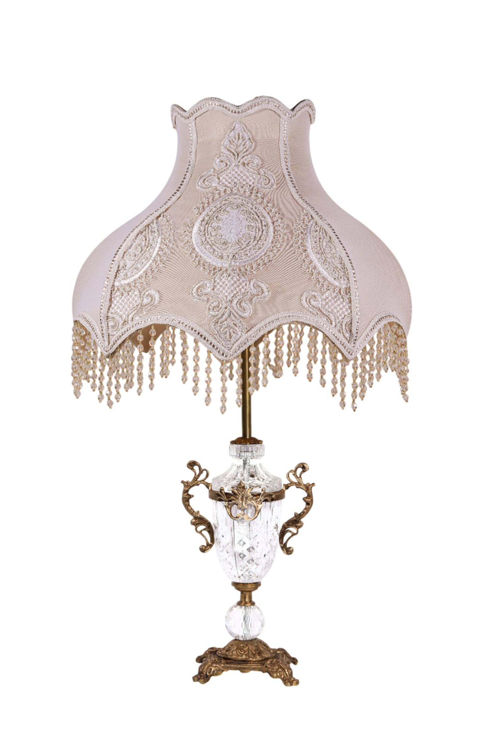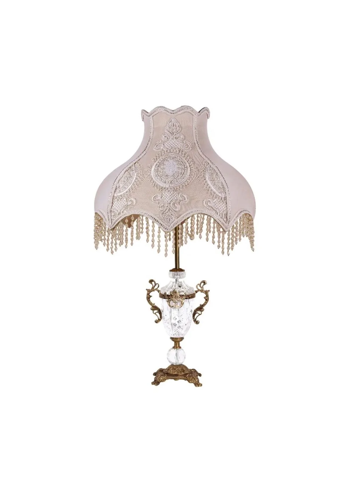 مصباح طاولة فاخر يجمع بين النحاس والكريستال النقي، مع غطاء من الغيبور التركي وحبات الكريستال.