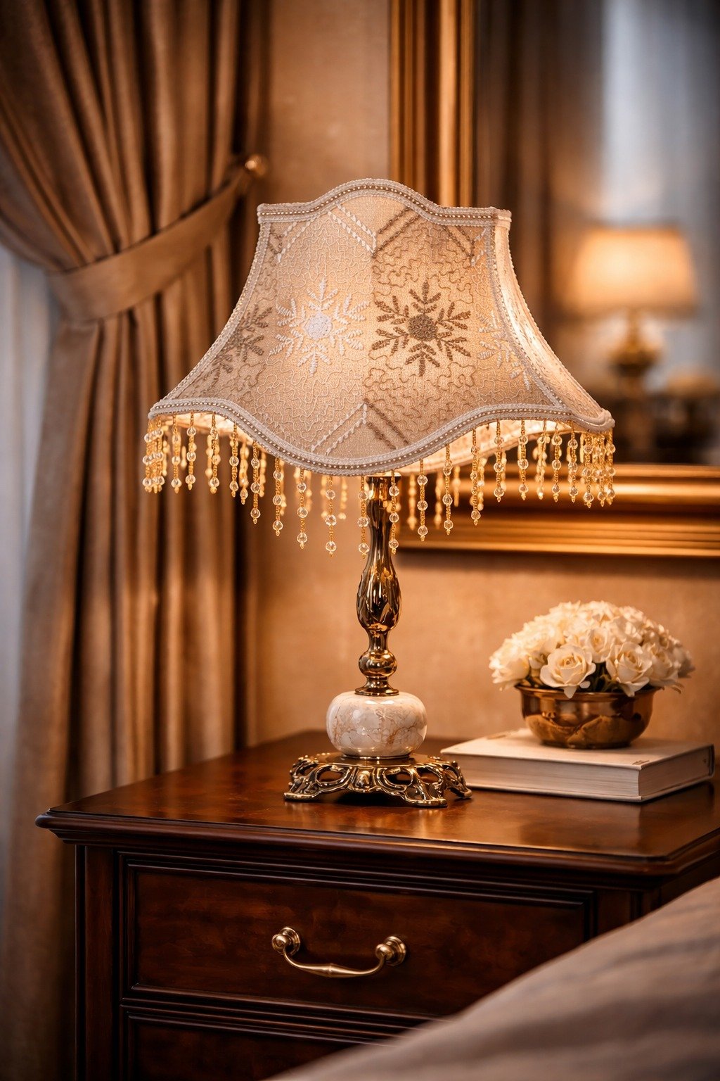 Classic brass table lamp with a Turkish Guipure shade and crystal beads.