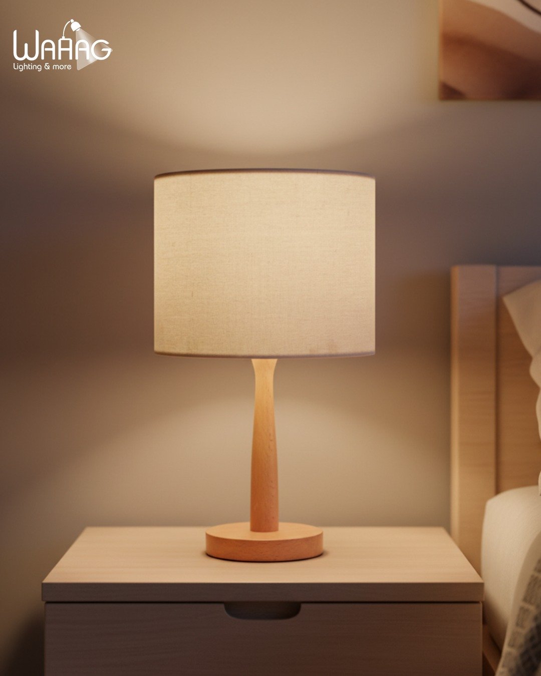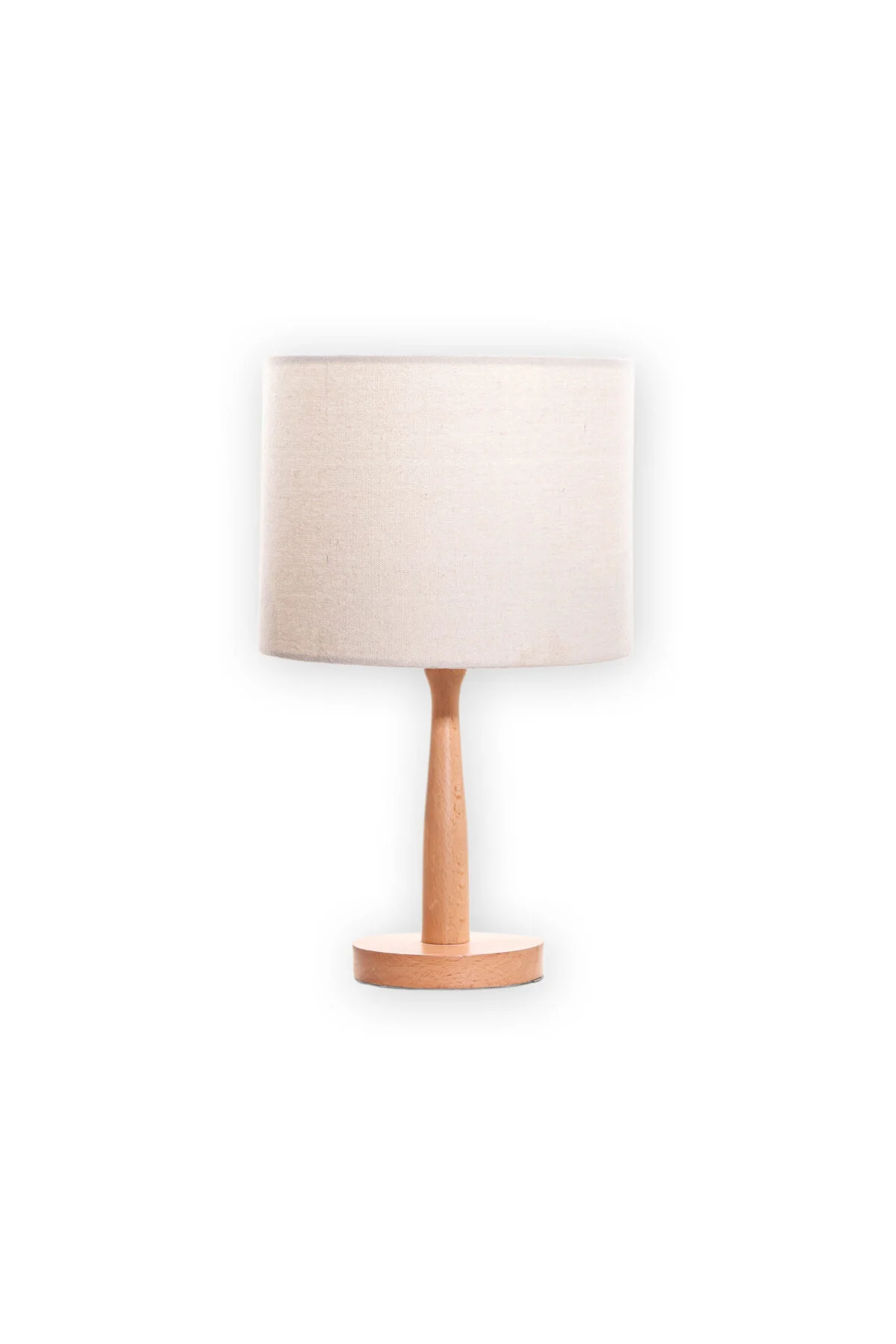 مصباح طاولة بقاعدة رفيعة وأنيقة من خشب الزان وغطاء طويل.
