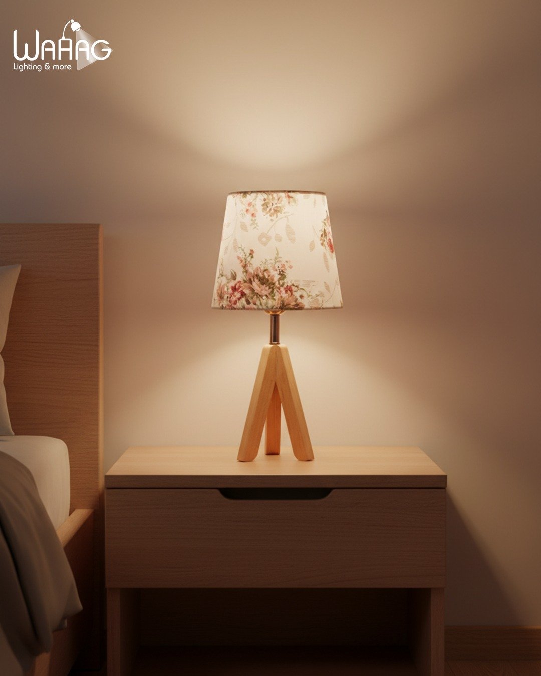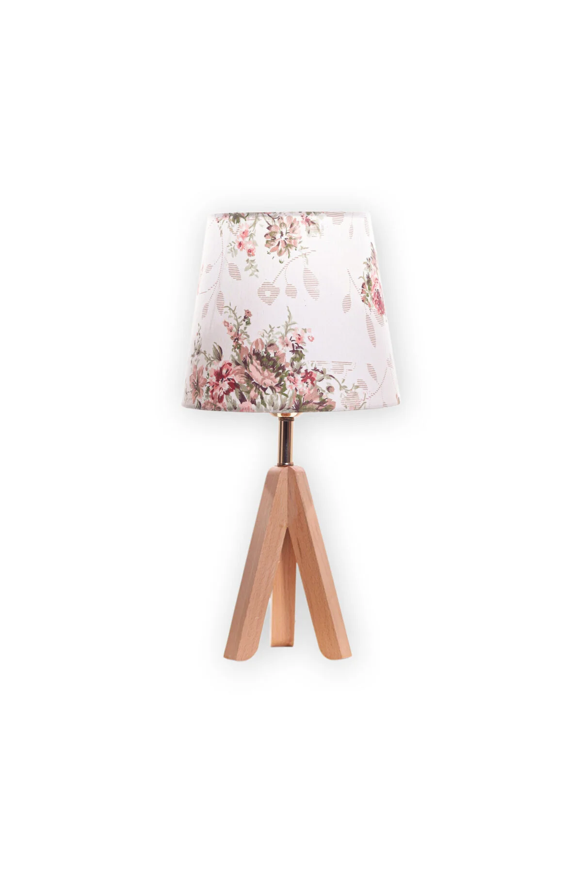 مصباح طاولة بتصميم ثلاثي القوائم مصنوع من خشب الزان وغطاء بنمط زهور.