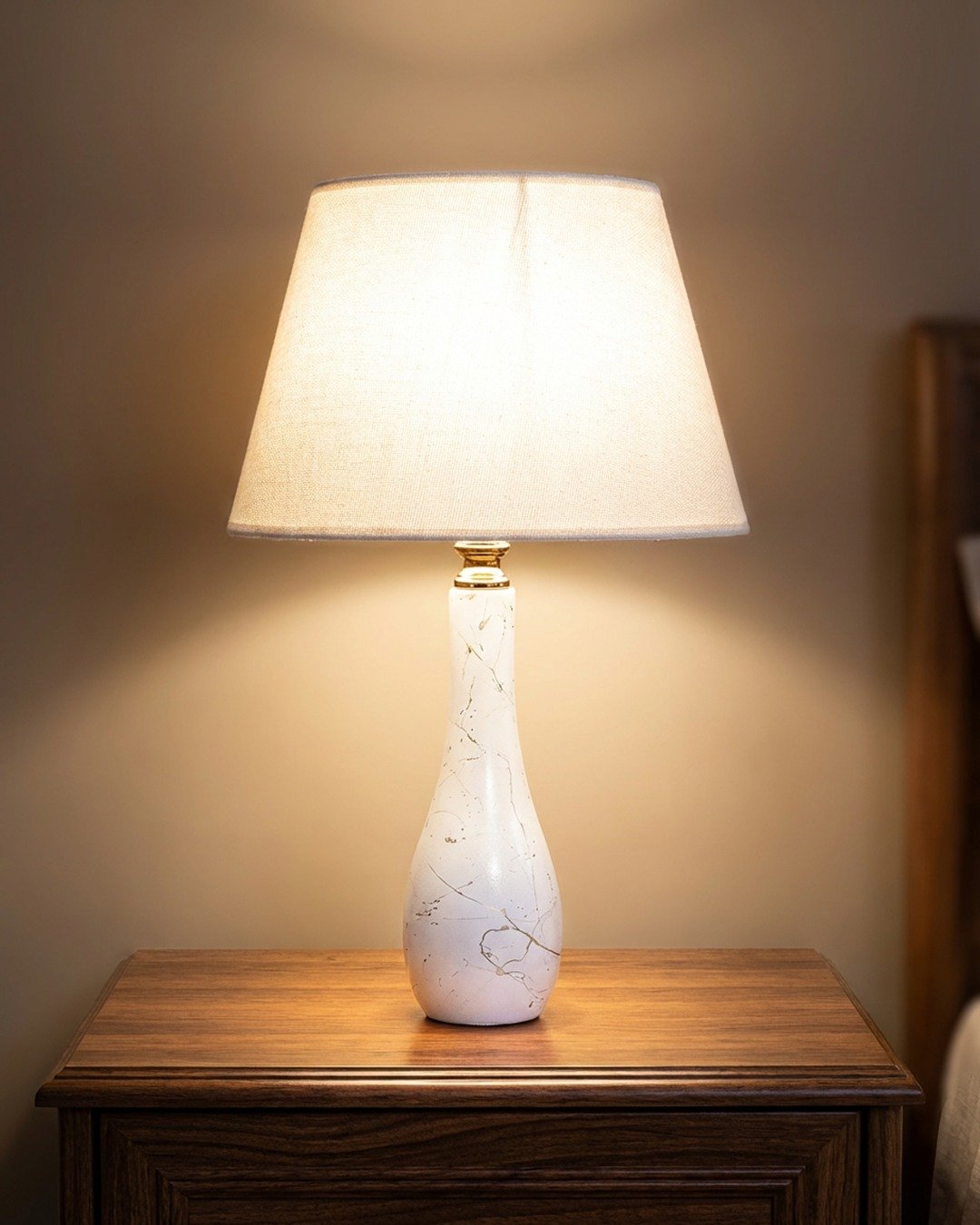 Table lamp with a smooth design made of beech wood in a white marble finish.