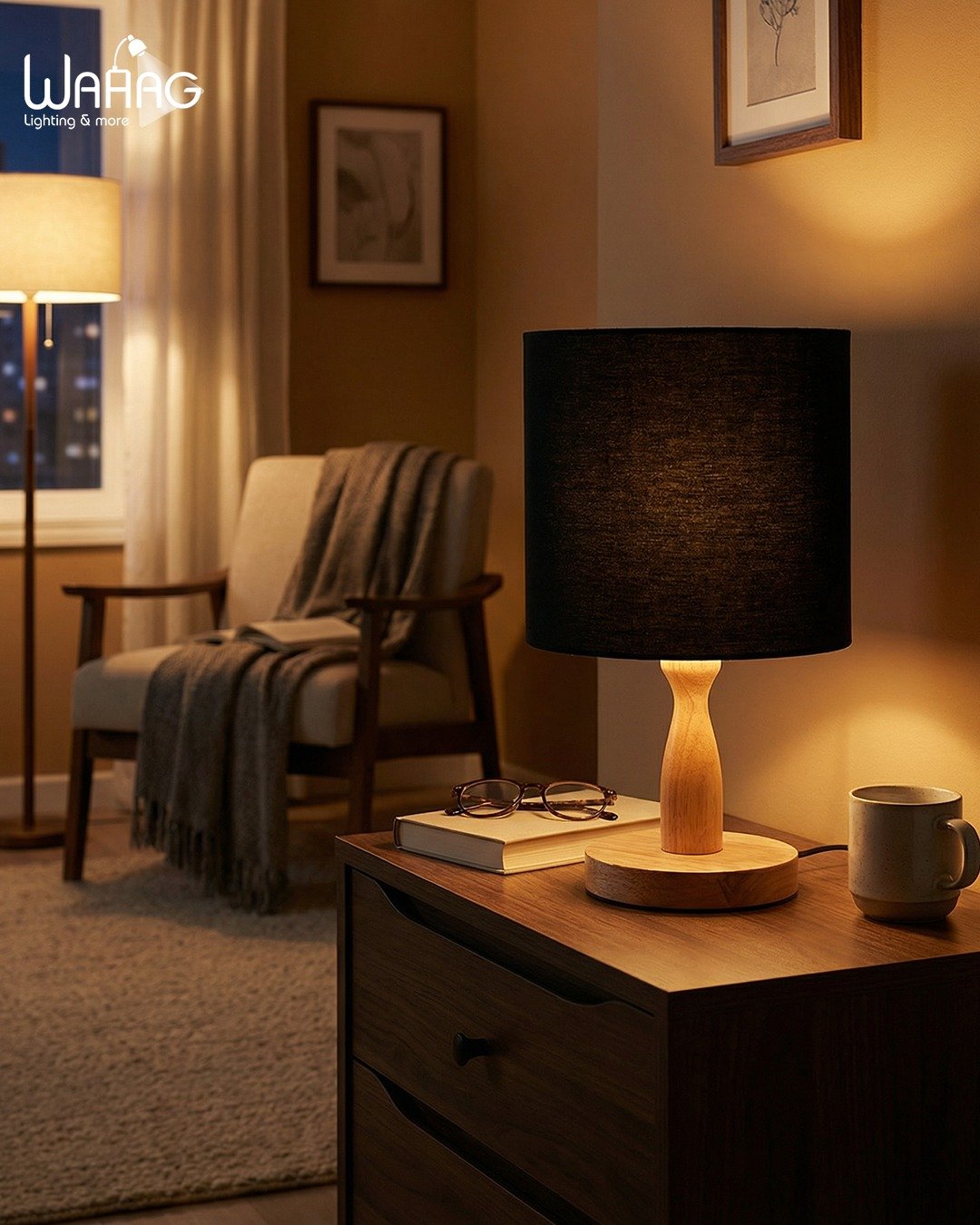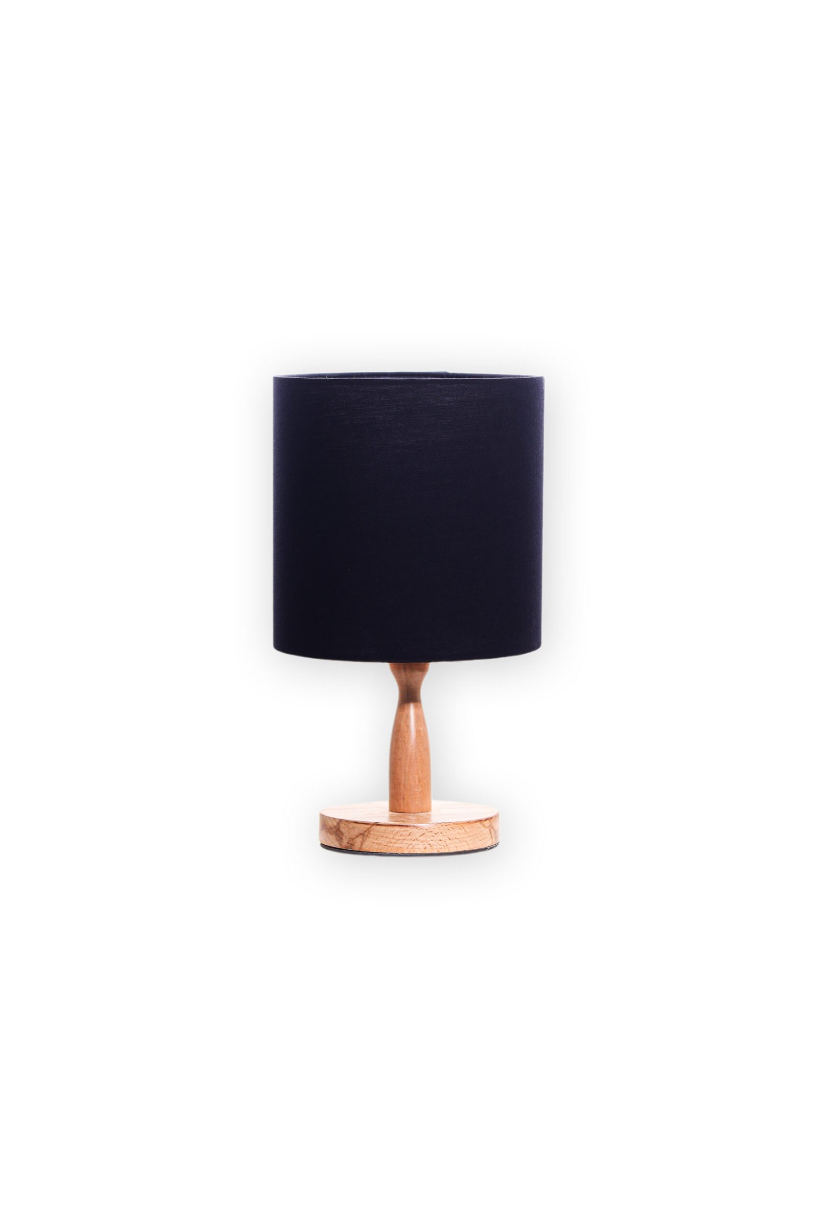 Table lamp with a slender, elegant beech wood base and a black shade.
