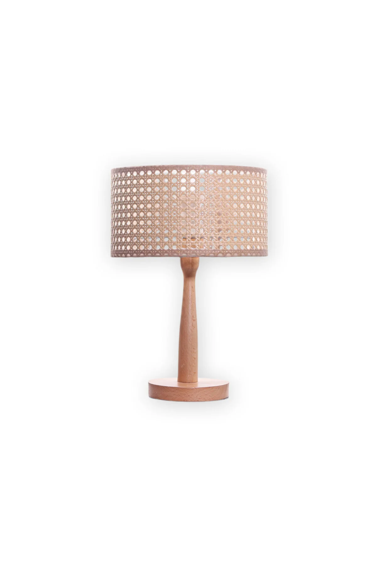مصباح طاولة بقاعدة من خشب الزان وغطاء مميز بنمط الروطان.