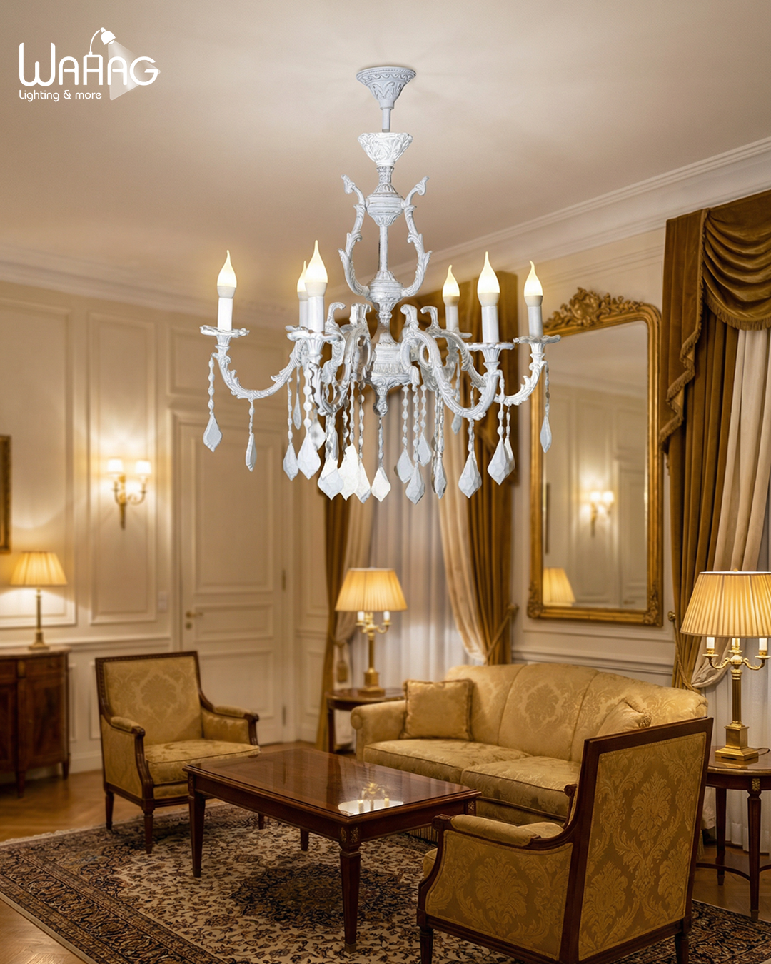 استمتع بجمال التصميم الكلاسيكي الخالد مع نجفة “أورورا” من وهج. تتميز هذه التحفة بستة أذرع منحنية بتصميم فني، مغطاة بتشطيب “وايتي” ملكي يضفي إشراقًا فوريًا على أي مساحة. تعمل قطرات الكريستال المستورد المتدلّية كمنشورات ضوئية تعكس الضوء لتخلق تجربة بصرية ساحرة. لتكون الخيار الأمثل للصالونات الراقية أو غرف الطعام الفاخرة.
