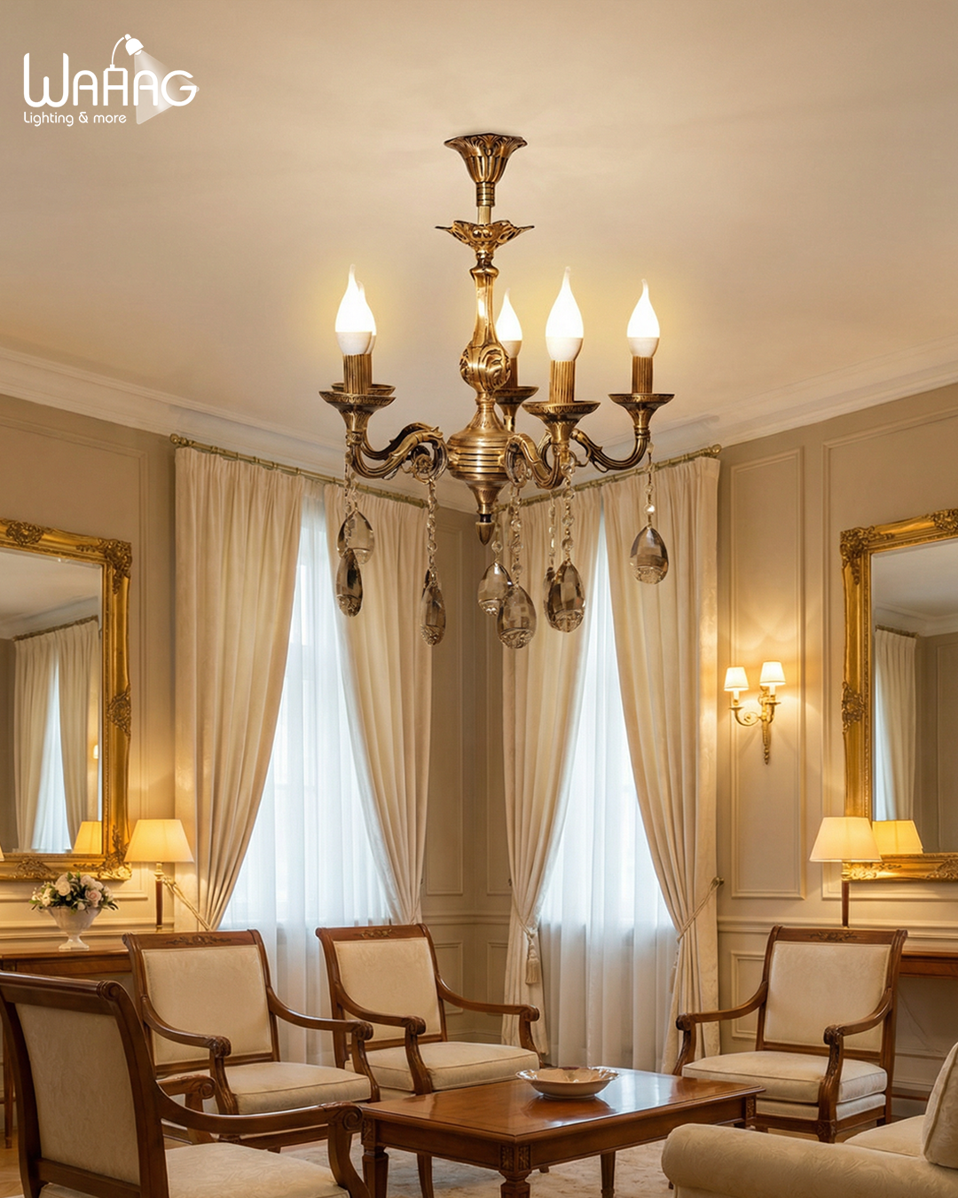 يكتمل سحر التفاصيل في نجفة “أنتيك ستار” من وهج. تتميز هذه القطعة بتصميم متناسق تمامًا يجمع بين فخامة النحاس المصري الأصلي وبريق الكريستال المستورد بلونه الكهرماني، ليمنح المكان إضاءة ناعمة ومريحة للعين. وبفضل أذرعها الخمسة الانسيابية وحجمها المدمج، تُعد الخيار المثالي لغرف النوم الرئيسية أو غرف الطعام الصغيرة التي تبحث عن طابع كلاسيكي يجمع بين الدفء والرقي.