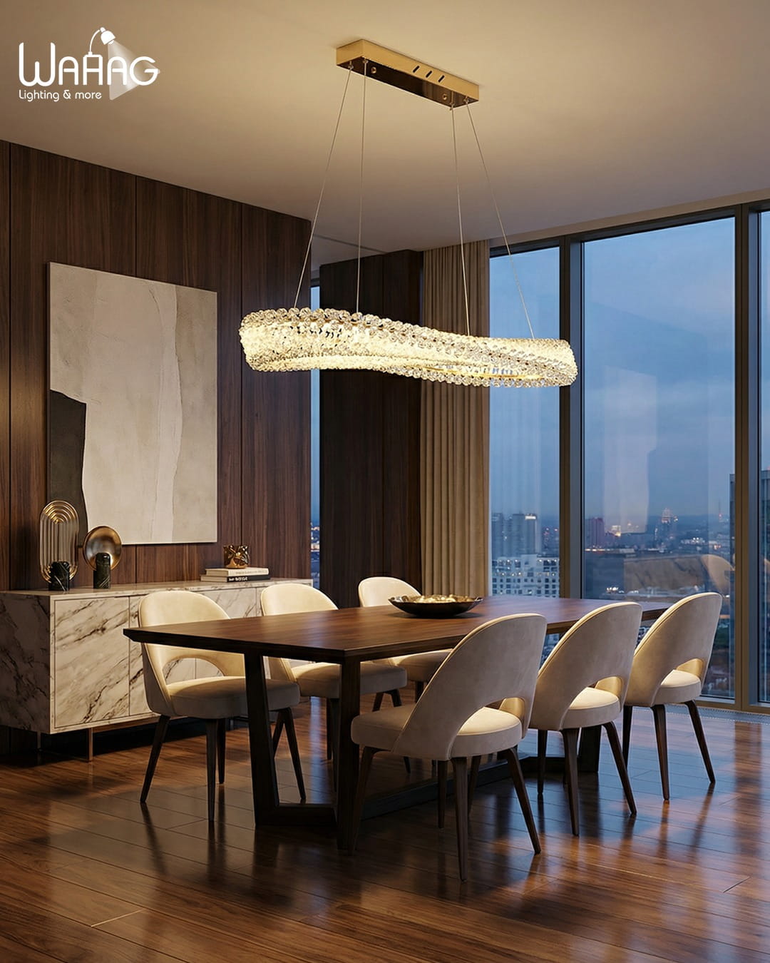 ارتقِ بمساحتك المعيشية مع الأناقة المبهرة لثريا “سيلستيال إليبس”. يتميز هذا التصميم بحلقة عائمة مذهلة، مزينة بمئات الكريستالات التي تعكس الضوء لتخلق أجواء متلألئة تشبه النجوم. بتصميم عصري أنيق وراقي، تُعد هذه القطعة نقطة محورية مثالية لغرف الطعام أو قاعات الاستقبال. مزودة بإضاءة LED مدمجة عالية الكفاءة وأسلاك تعليق قابلة للتعديل، لتقدم مزيجًا متكاملًا من الفخامة الفنية والراحة العصرية.