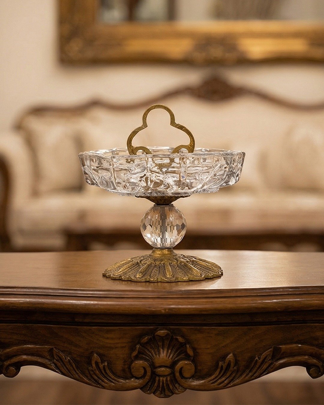 أضف لمسة من الرقي الكلاسيكي إلى مكتبك أو غرفة معيشتك مع هذه المنفضة الفريدة. تحفة فنية تجمع بين الزجاج المستورد الشفاف والنحاس الفاخر المصنوع يدويًا، وتتميز بتصميم راقٍ مع كرة كريستالية في المنتصف وقاعدة نحاسية مزخرفة بدقة متناهية.