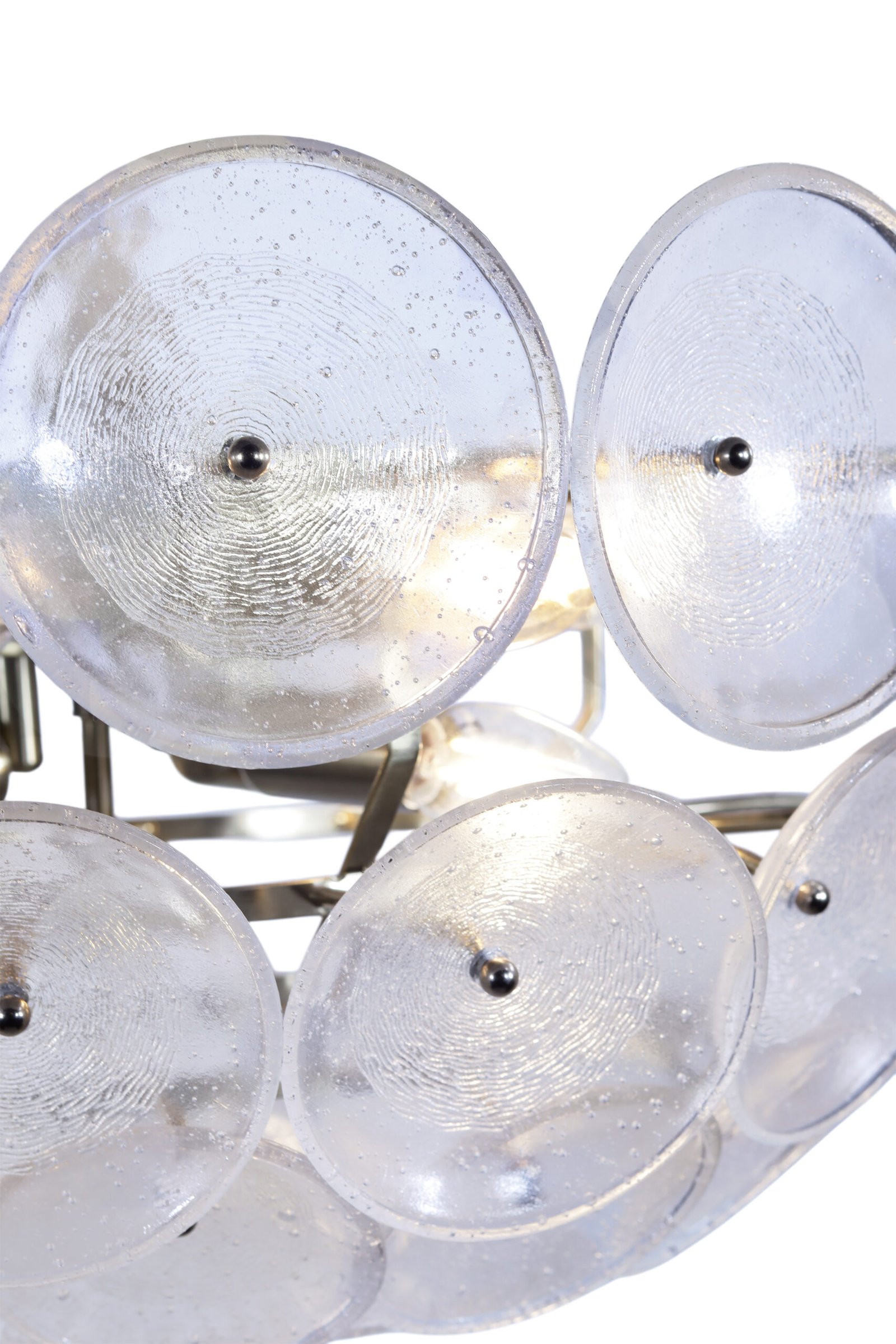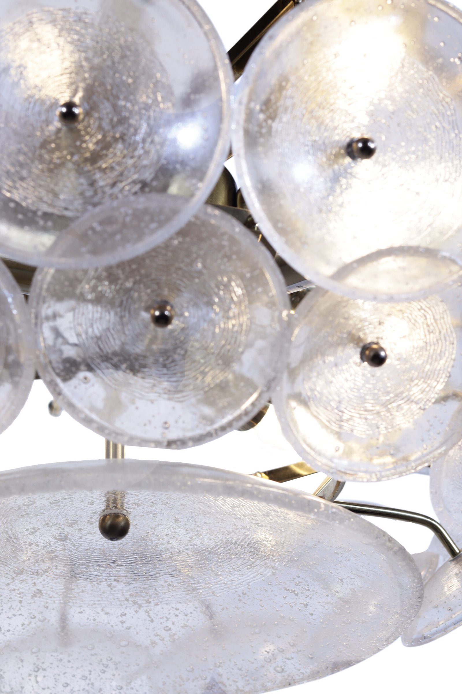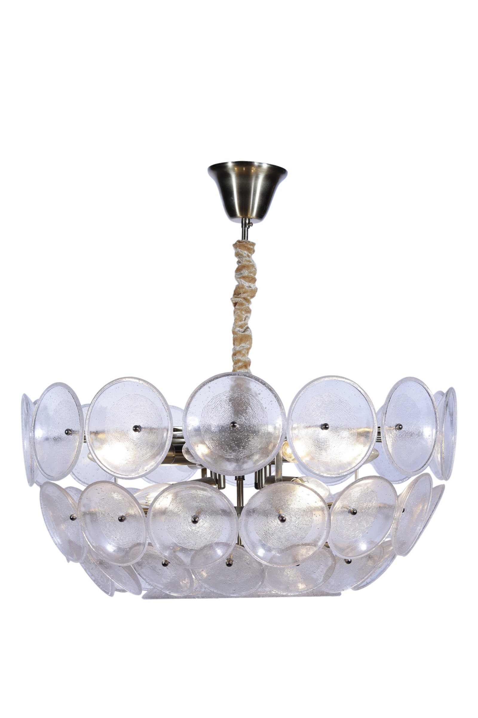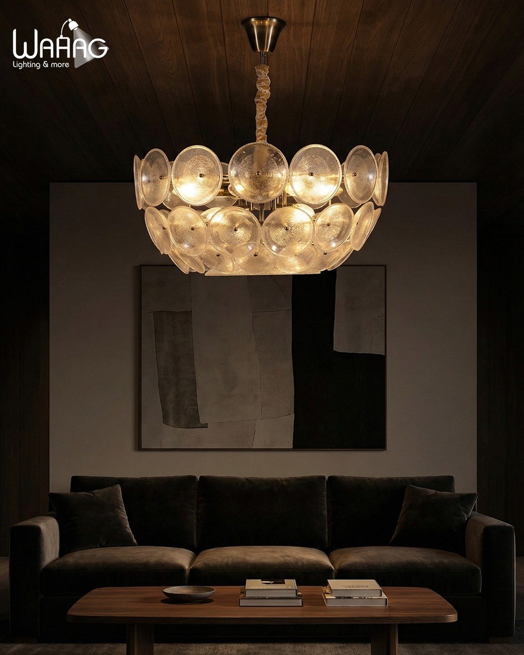 The Aura Chandelier seamlessly blends classical elegance with innovative modern design. It features unique circular glass discs with a rippled texture that beautifully diffuses light, creating a warm glow and a captivating visual effect. With its 60cm diameter and premium oxide finish, this chandelier serves as a stunning centerpiece, adding a touch of luxury to living rooms or reception areas.
