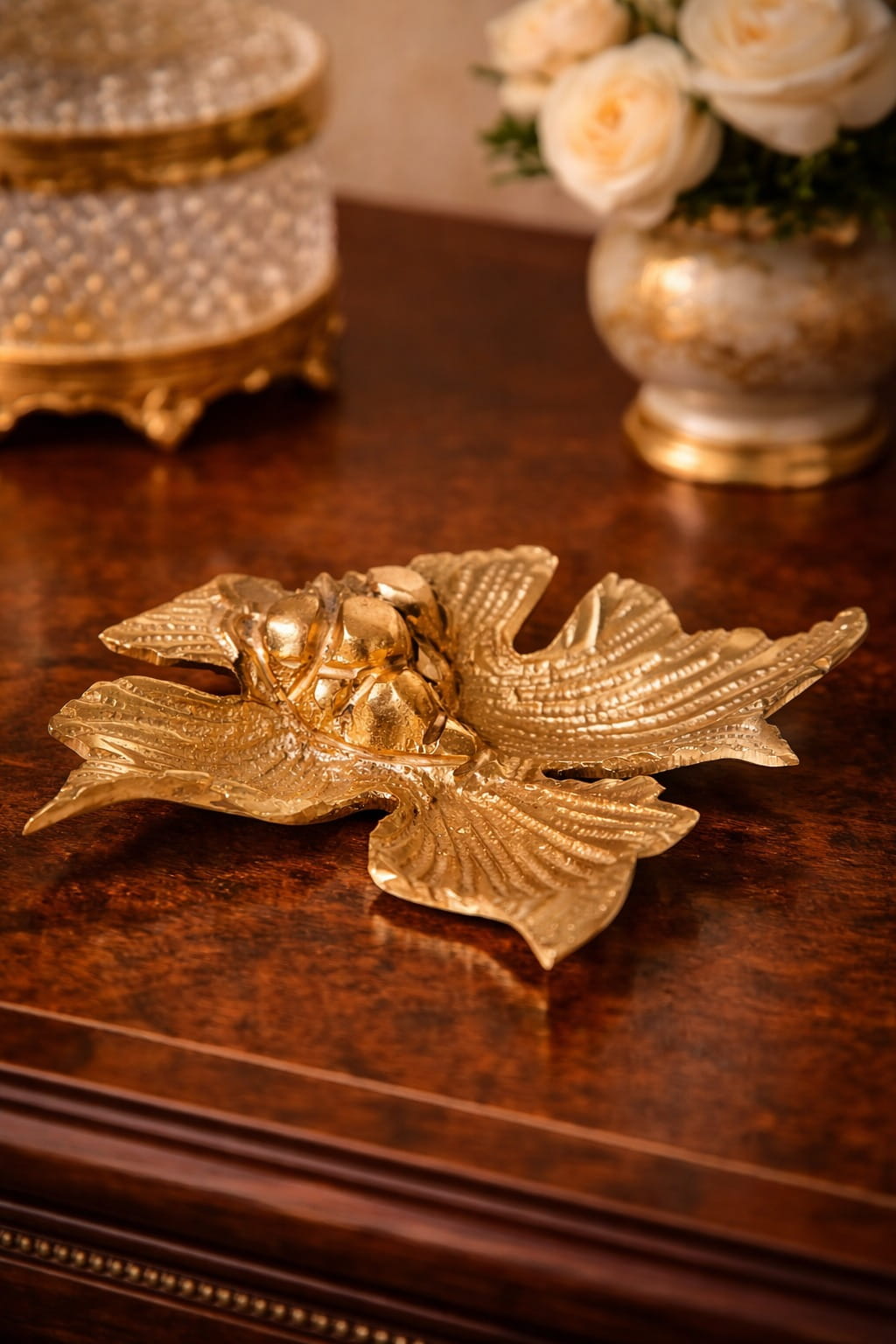 This artistic piece embodies extreme precision in mimicking natural beauty, crafted in the shape of a leaf with stunning details that highlight its delicate veins and organic curves. Made entirely of authentic brass with a warm golden hue, it is more than just decor; it is a statement of refined taste and a connection to timeless classical arts.