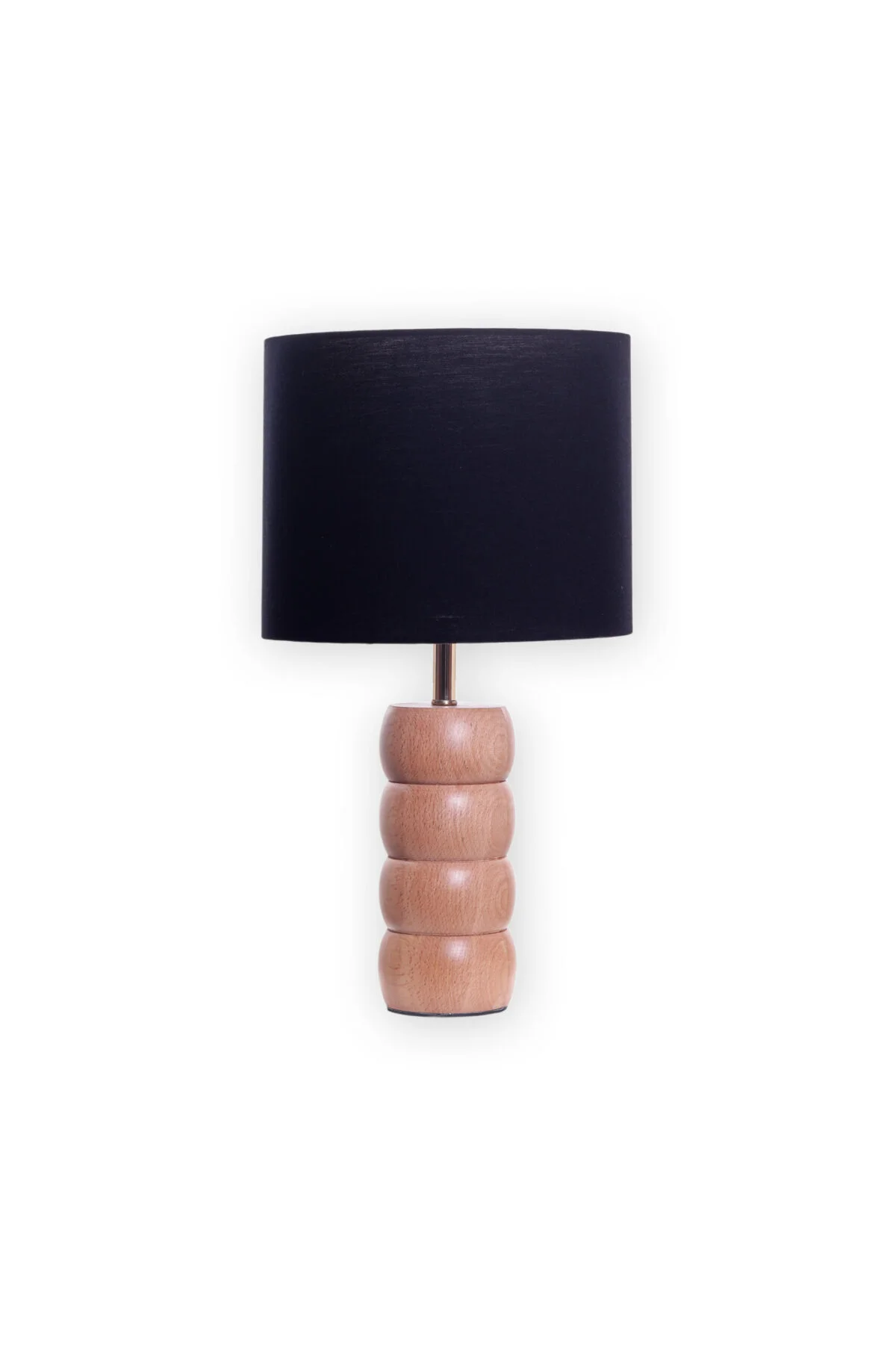 Table lamp with a bubble design made of natural beech wood and a black shade.