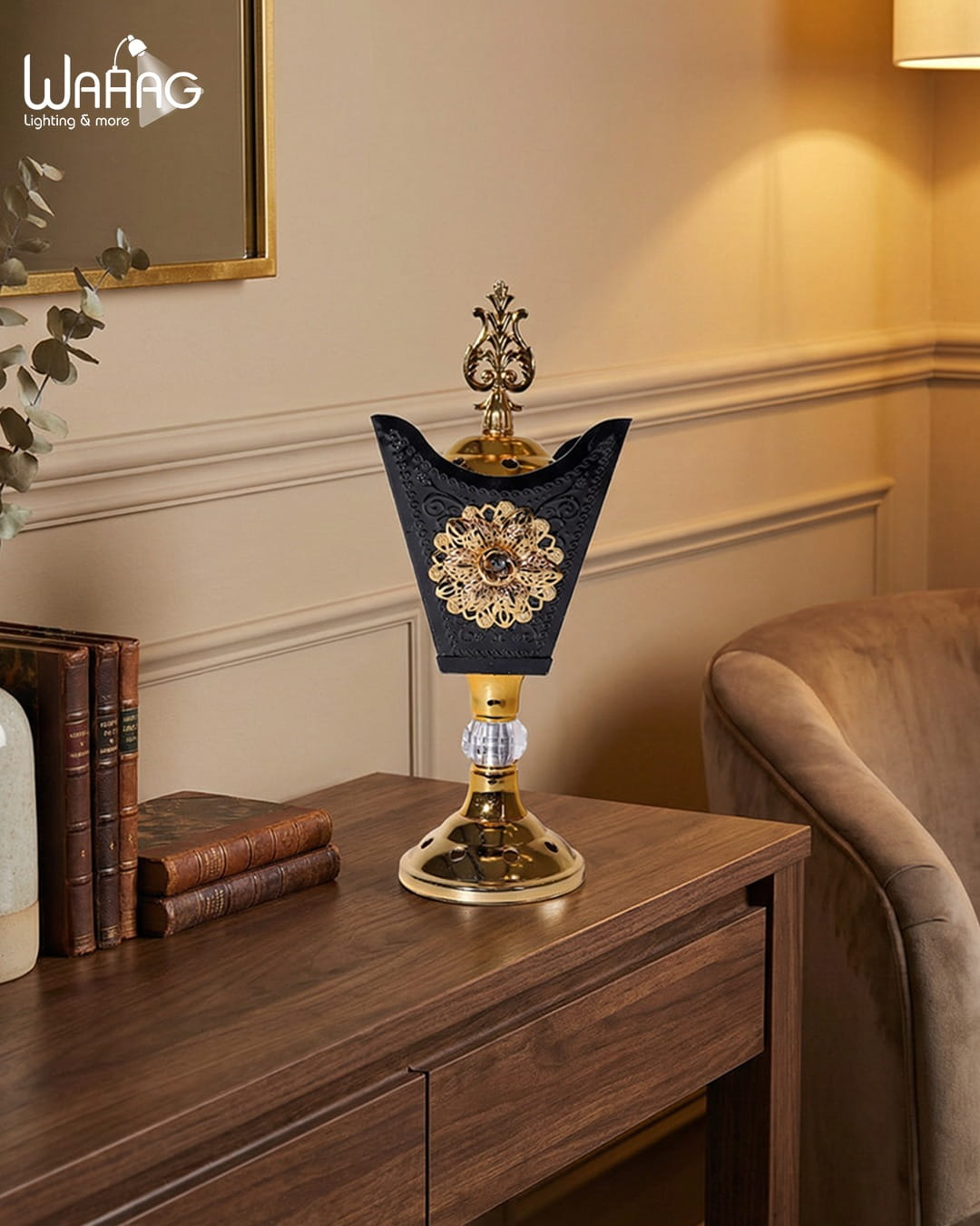Elevate your aromatic rituals with the Onyx Sultan Incense Burner. A true masterpiece of traditional craftsmanship, this burner features a bold jet-black body adorned with an intricate golden filigree flower at its center. Its regal silhouette is elegantly balanced by a shimmering crystal stem and a majestic golden finial lid. Whether used for your daily scent or as a luxurious statement piece on a console, it perfectly honors heritage while adding a touch of modern opulence to your home.