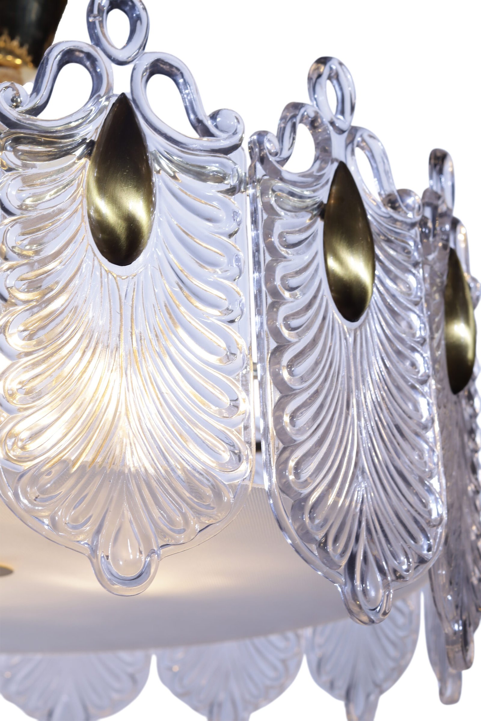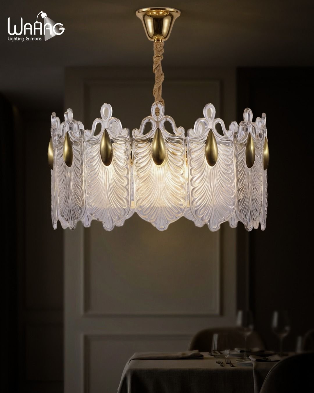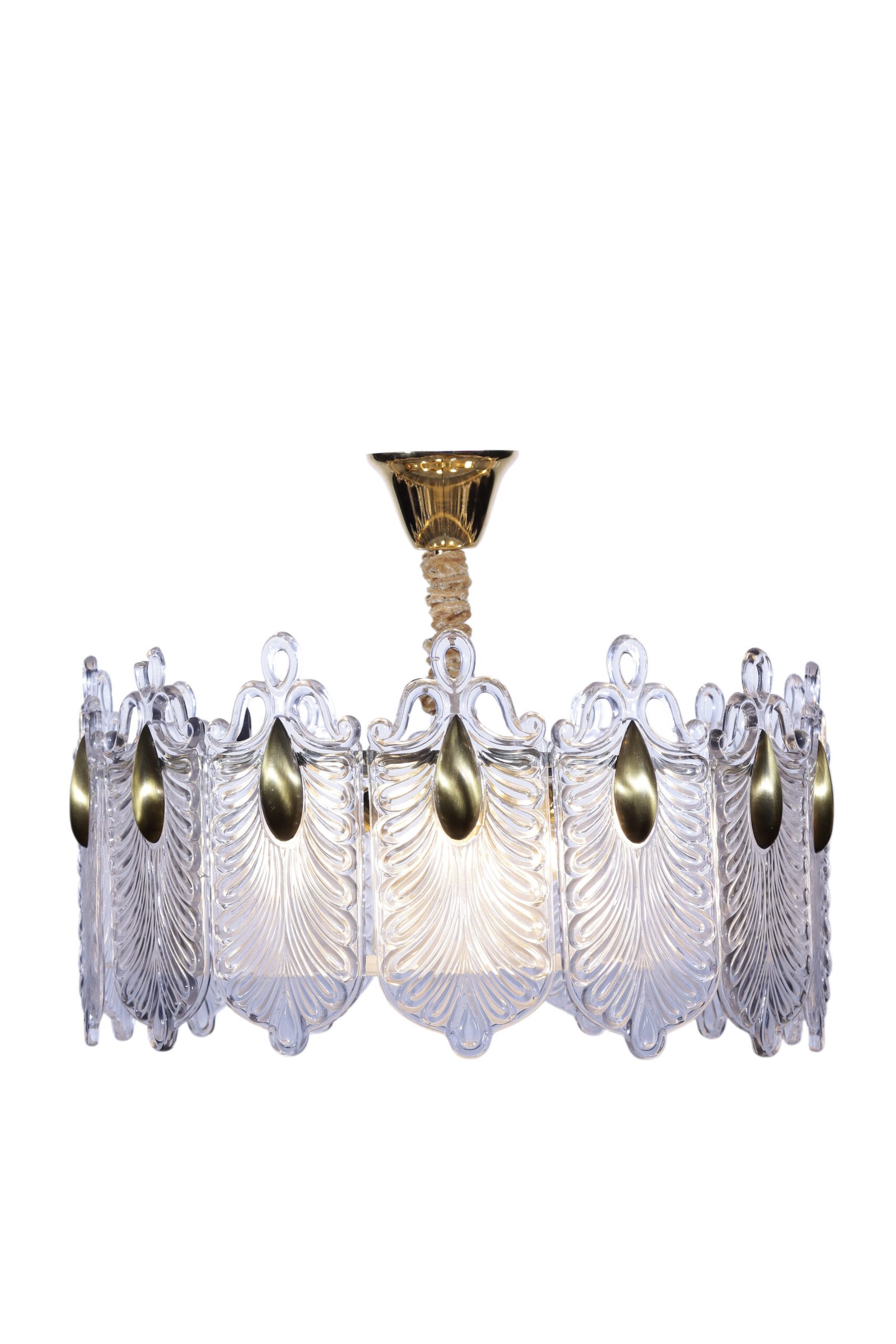 The Regalia chandelier is an exceptional piece that embodies royal luxury in every detail. Featuring a majestic crown-like design, it is adorned with intricately engraved glass plates finished with shimmering golden droplets for a touch of visual opulence. The perfect “New Classic” choice for those seeking an unforgettable imperial look for their reception rooms.