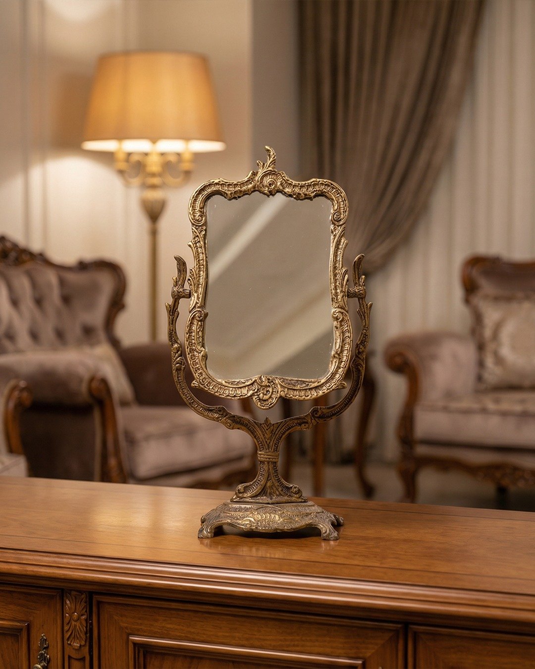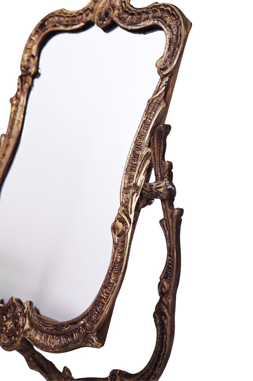Add a touch of Victorian luxury to your vanity with this exquisite brass mirror. Featuring a meticulously handcrafted pure brass frame and a sturdy ornate base, its tilting design offers both elegance and functionality. A timeless classic decor piece that never goes out of style.