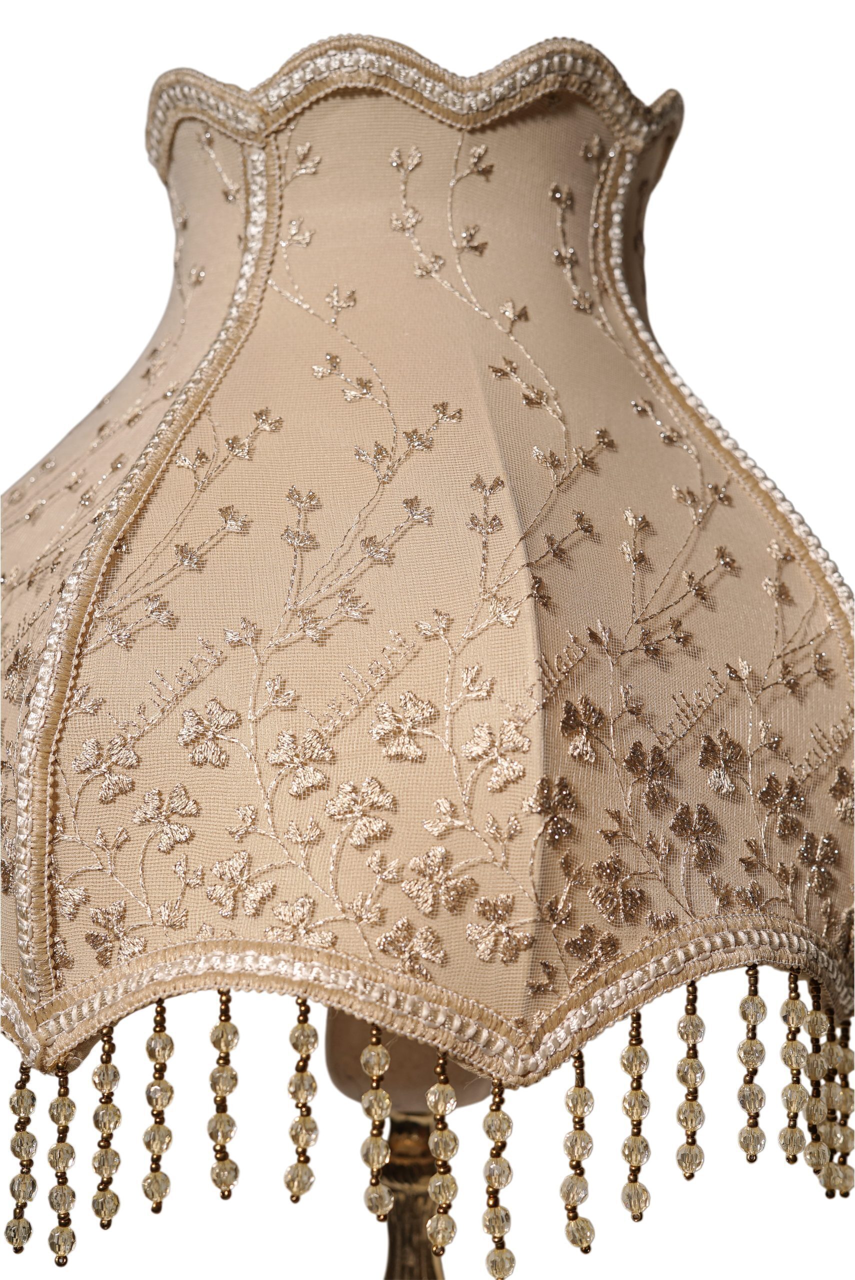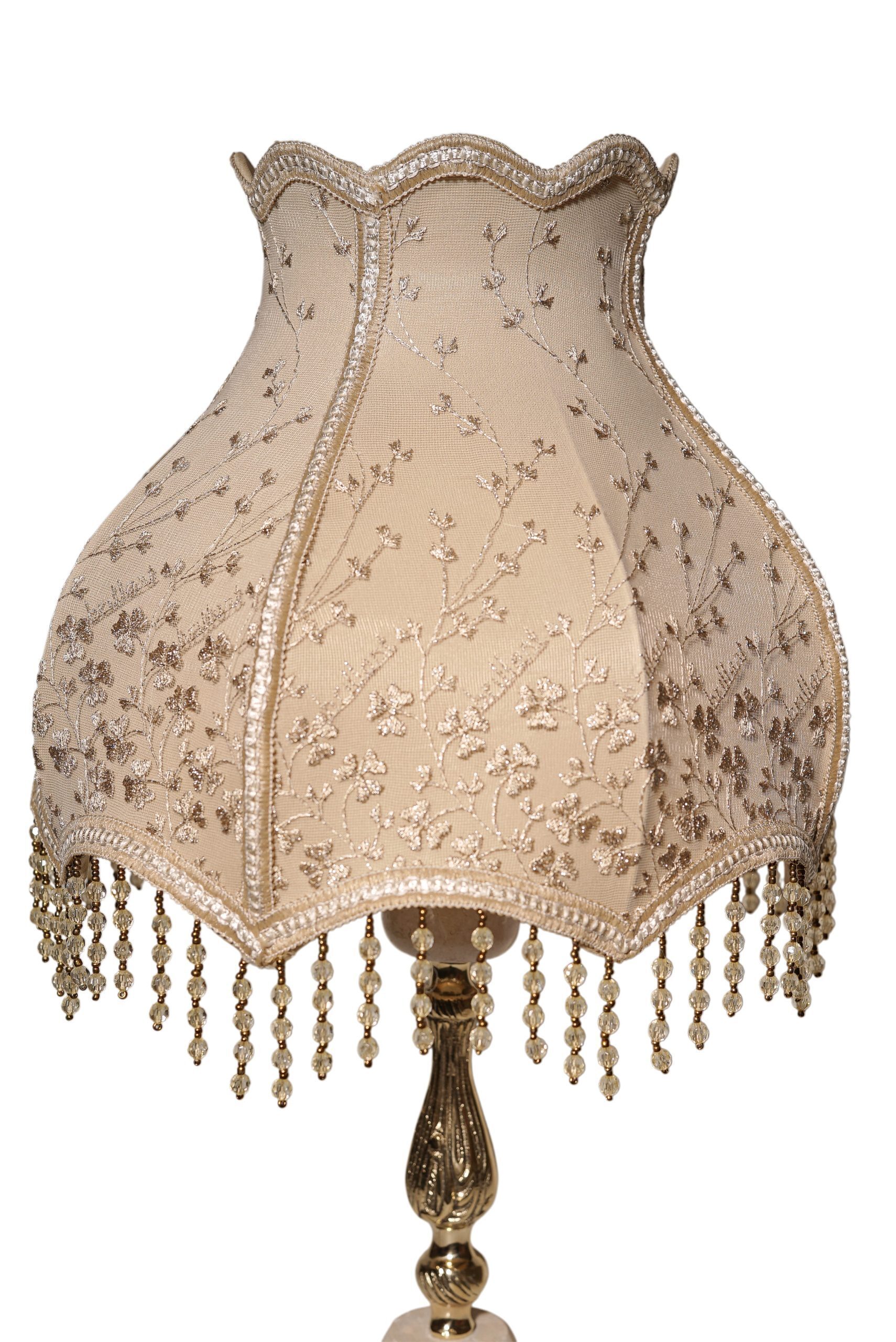 This lamp is a majestic masterpiece designed to be the centerpiece of sophisticated reception rooms and salons. It features an imposing base that combines authentic engraved brass with polished natural marble. Crowned with a large shade made of premium Turkish Guipure fabric, embroidered with intricate floral patterns, it adds a touch of aristocratic elegance to your home.