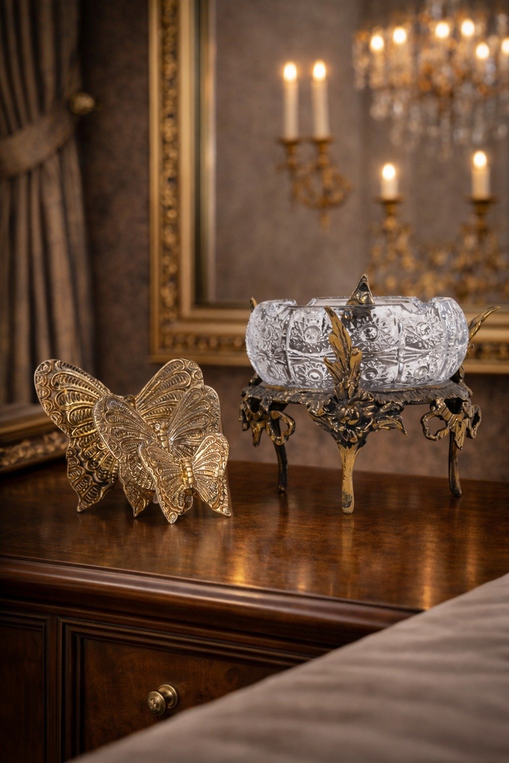 A complete luxury decor set blending the brilliance of crystal with the timelessness of brass. This curated collection includes a premium imported glass ashtray with an ornate brass base, paired with a handcrafted 3-piece brass butterfly set in graduated sizes. A perfect harmony of style for upscale offices or elegant living rooms.