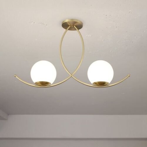 Add elegant modern style to your space with the Intertwine Chandelier. Its design features an interlocking gold ceiling-mount fixture holding two luminous white glass spheres, creating a warm and attractive atmosphere.